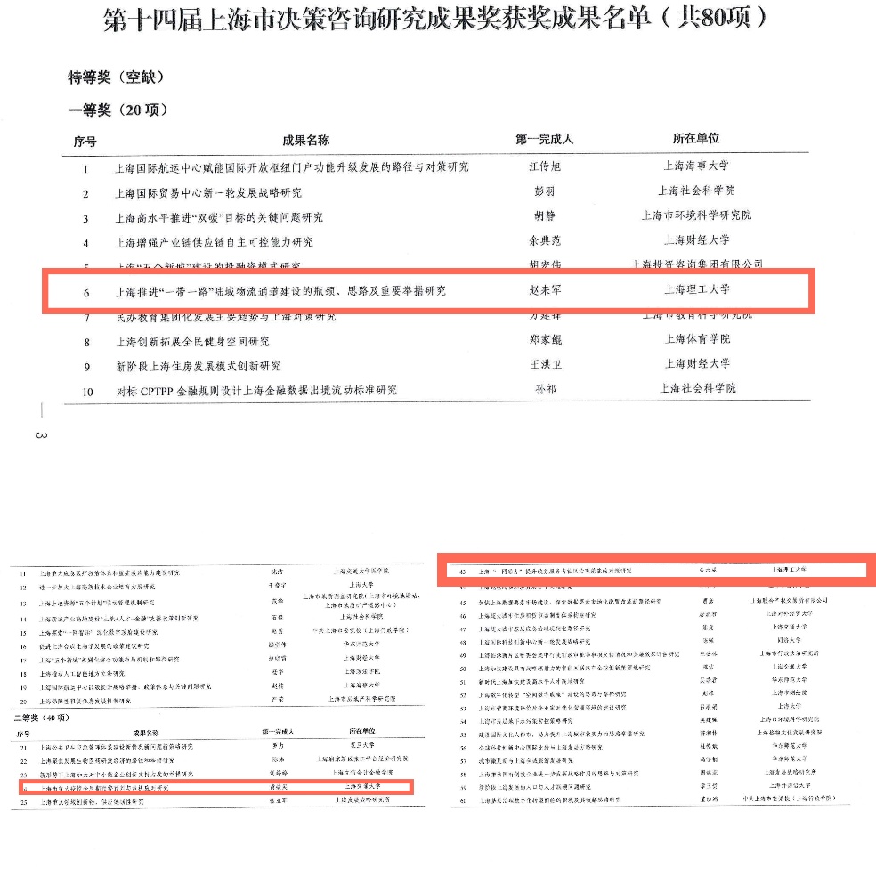 近日,上海市人民政府办公厅印发《关于表彰第十四届上海市决策咨询研究成果奖获奖成果的决定》。本届共有80项成果获得了奖励,其中一等奖20项,二等奖40项,三等奖20项。管理学院取得了优异的成绩,共有3项成果获奖。其中,院长赵来军教授以第一完成人主持完成的《上海推进“一带一路”陆域物流通道建设的瓶颈、思路及重要举措研究》荣获一等奖,这是我校在上海市决策咨询研究成果奖上的重要突破。公共管理系主任朱水成副教授为第一完成人(赵来军教授为第二完成人)主持完成的《上海“一网通办”提升政务服务与社区治理效能的对策研究》以及系统科学系钱颖教授以第二获奖人、上海理工大学为第二完成单位的《上海市重大疫情全周期预警预判与危机应对研究》均荣获二等奖。