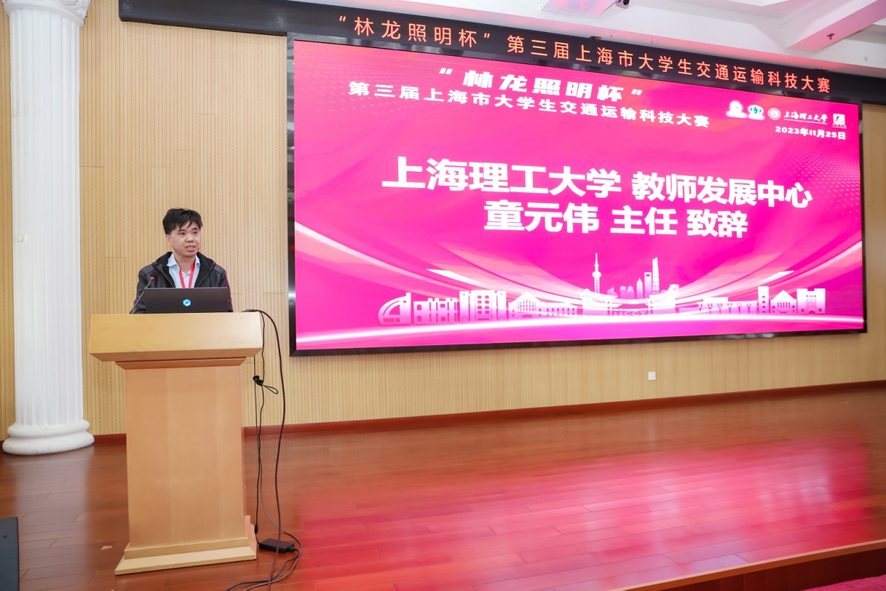 童元伟代表上海理工大学教师发展中心,对上海理工大学管理学院承办本次赛事表示衷心感谢,简要介绍了上海理工大学教师教学发展中心并分享了我校近年来在科创比赛中取得的优异成绩,感谢教育部教指委、上海市交通工程学会、上海市公路学会的各位领导莅临指导,以及上海林龙建设工程有限公司对本次赛事提供的全方位保障。