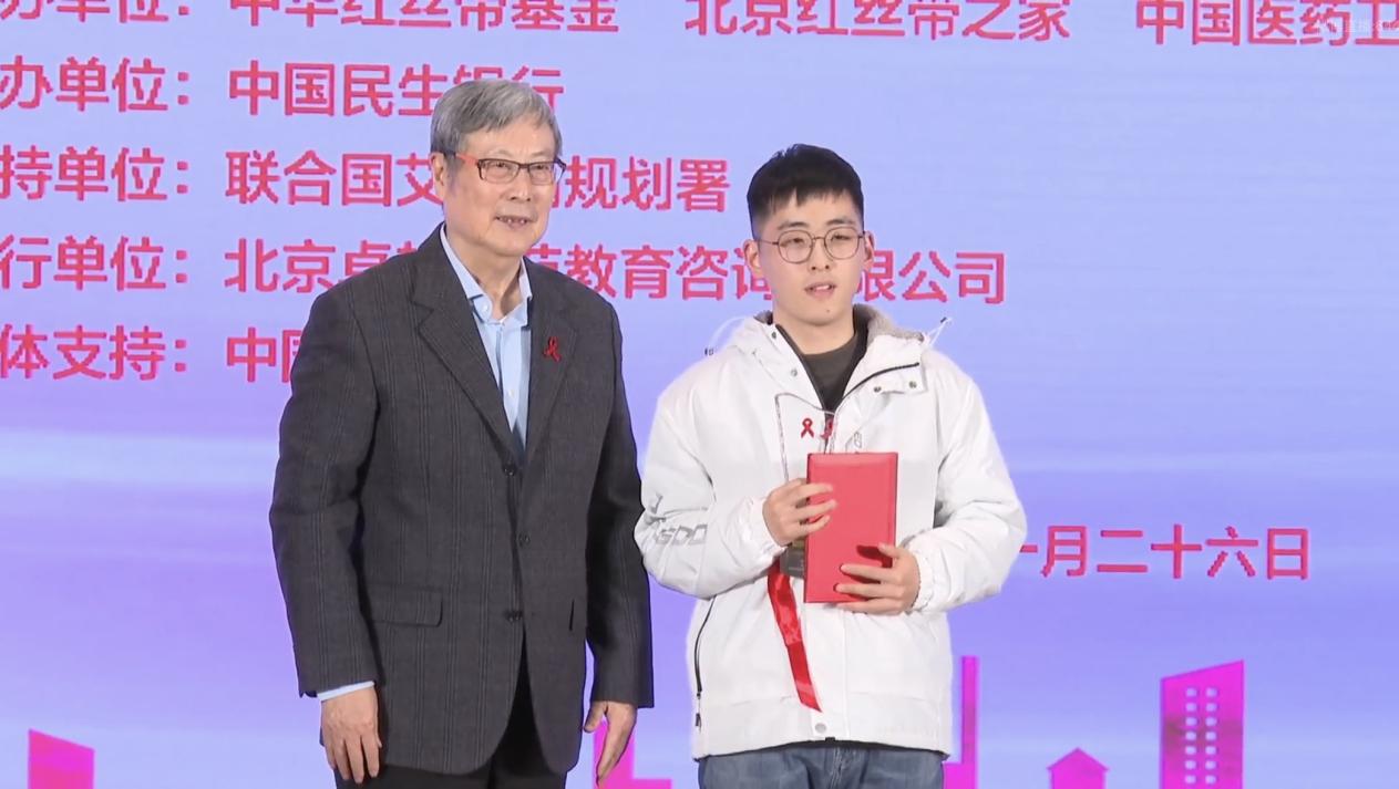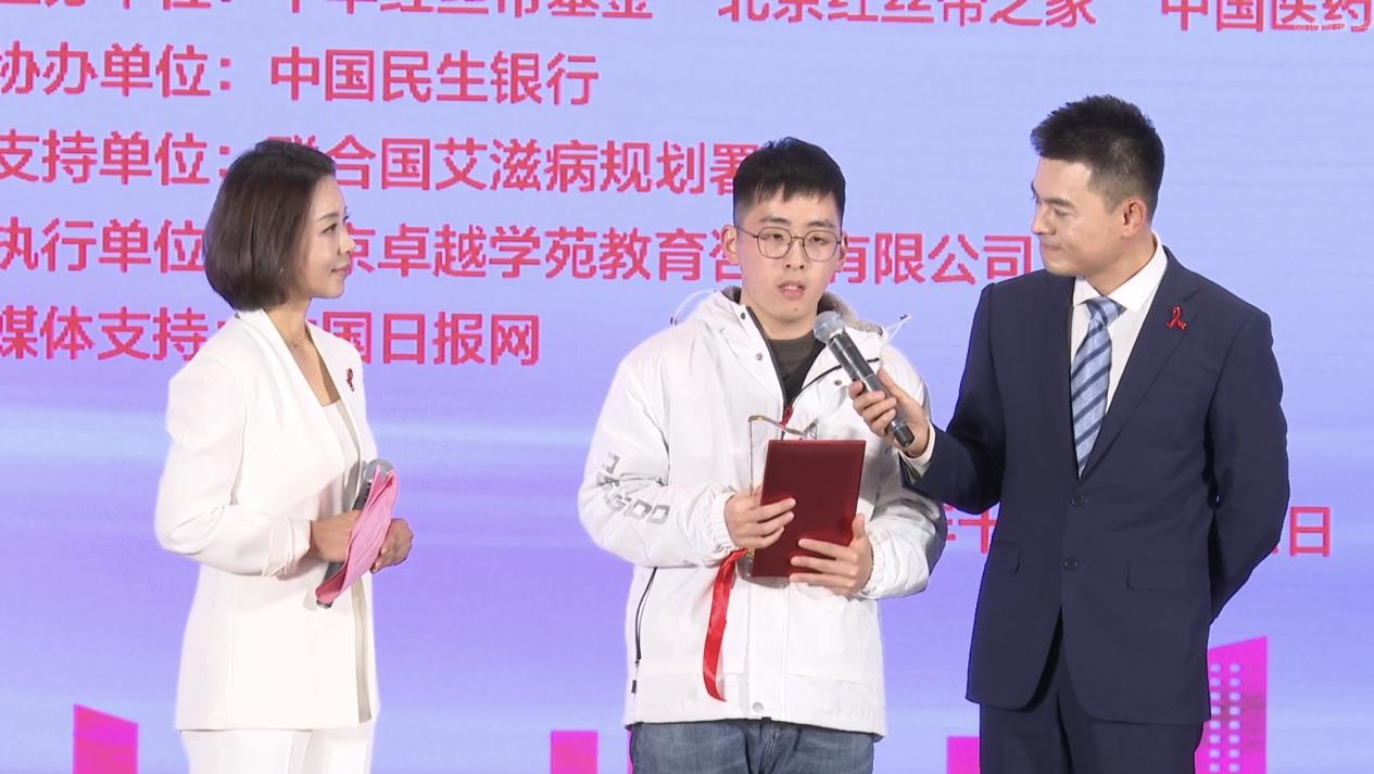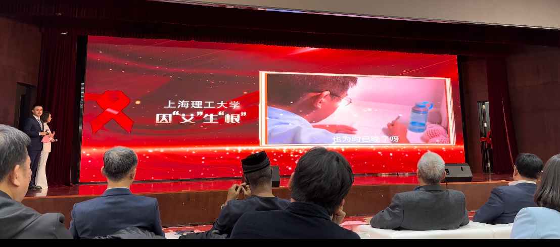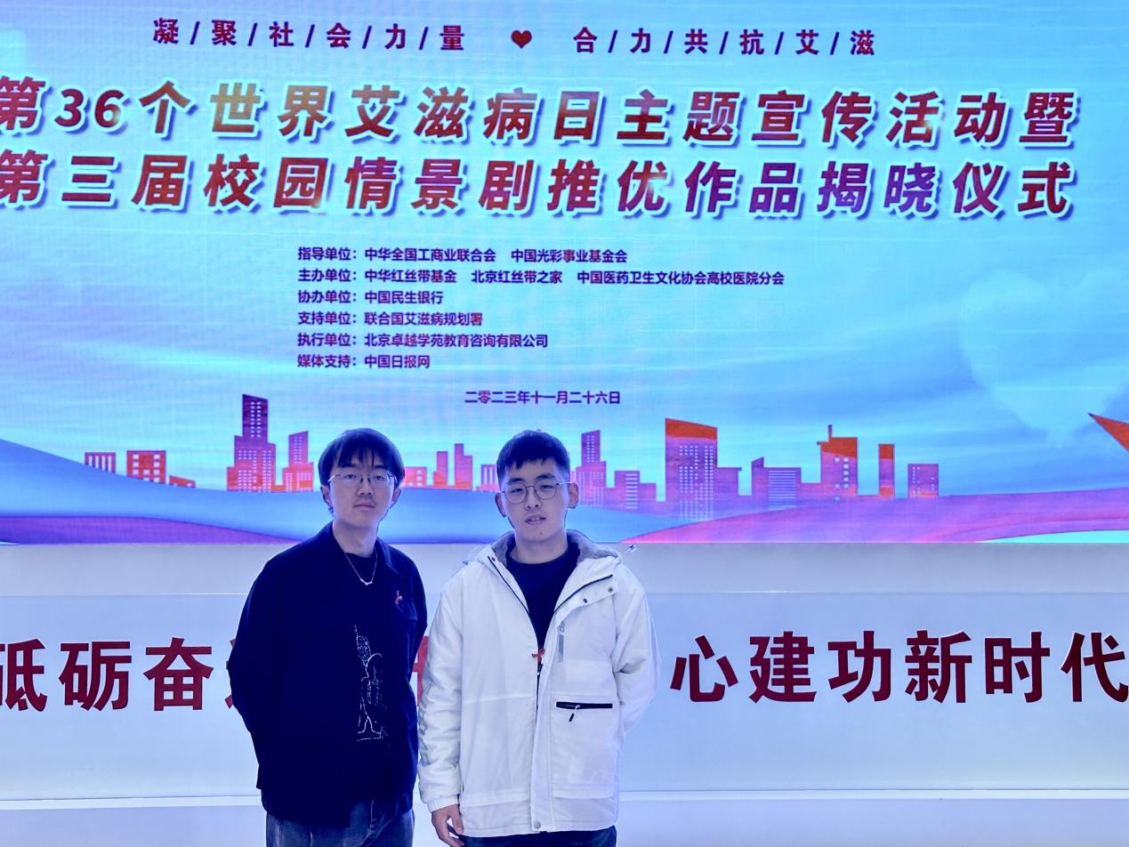 第二项议程是校园情景剧推优作品的揭晓。本次校园情景剧活动,走到了举办的第三个年头,旨在以通过学生自主创作演绎“防艾抗艾”校园情景剧的形式,让高校青年群体全面了解艾滋病防治知识,树立正确的防艾健康理念,以校园带动全社会,引领更多的人积极参与到红丝带防艾抗艾的工作中,共同抗击艾滋病,为2030年终结艾滋病和健康中国的目标而努力。上海理工大学作品《因“艾”生“恨”》作为参赛单位,其团队负责人、编导郑熙同学,与作品设计与摄像李博洋同学受邀参加此活动。
