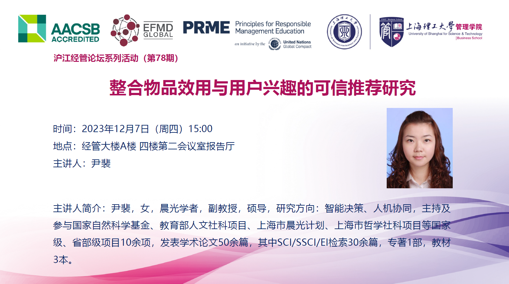 沪江经管论坛系列活动(第78期):整合物品效用与用户兴趣的可信推荐研究