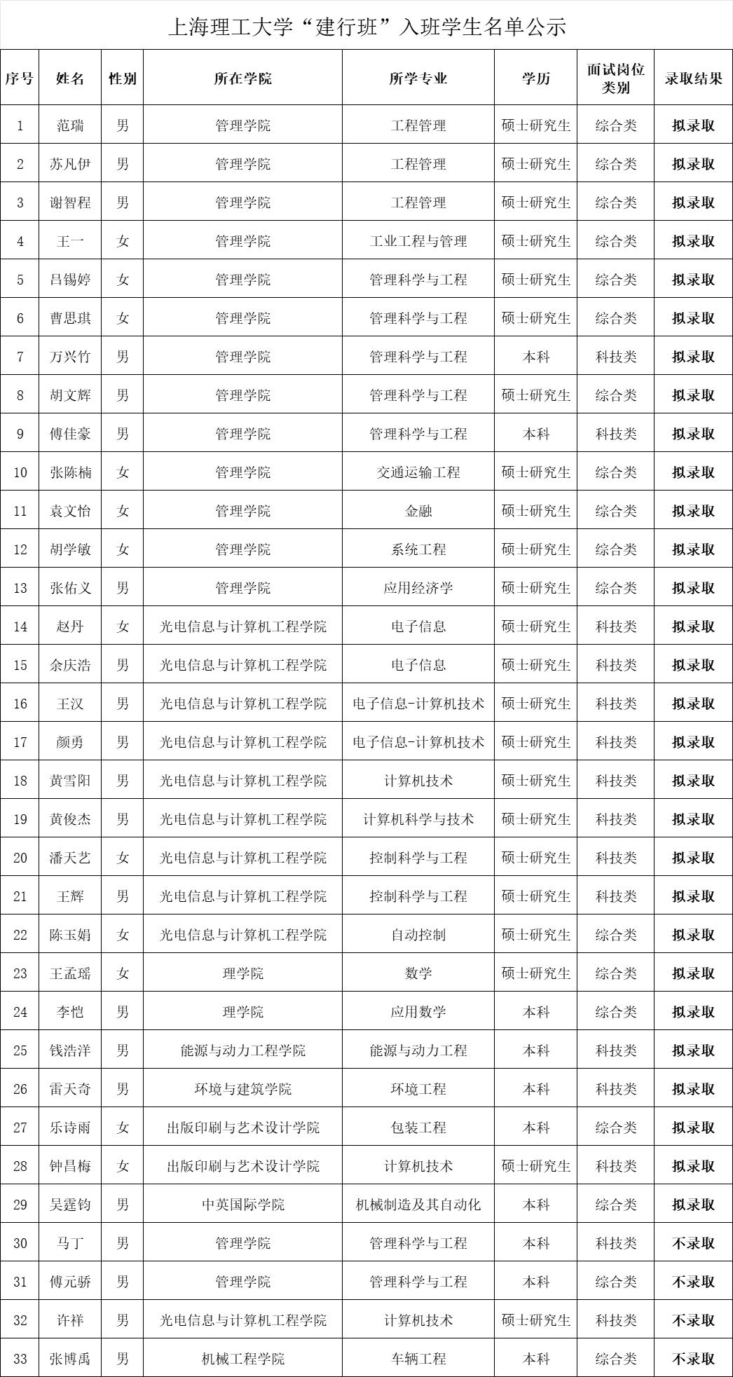 经学生申报、专家评审,现将上海理工大学“建行班”入班学生名单予以公示。