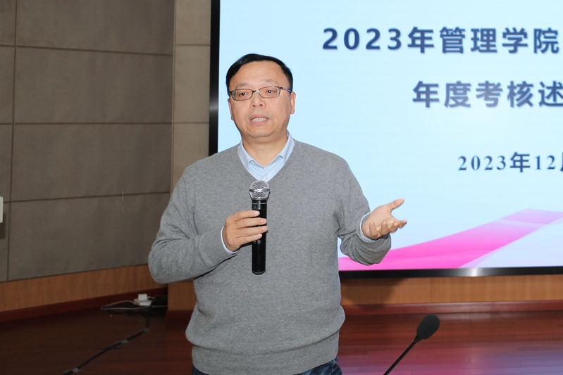 12月22日下午,管理学院在经管大楼A楼第二会议室报告厅召开2023年系领导年度考核交流会。学院党政班子成员、系领导考核工作小组成员、系主任、系副主任、系党支部书记、系秘书等参加会议。会议由院长赵来军主持。