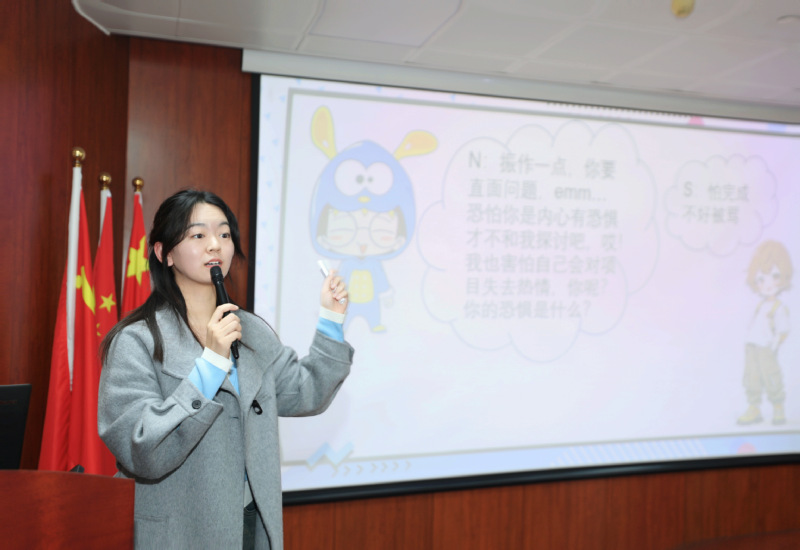 管理学院张宇凡通过“‘击鼓传花’说出你的答案”“情景对话扮演”“情景处理选择”等一系列生动有趣、参与感强的互动游戏带领大家认识了迈尔斯-布里格斯类型指标(Myers-Briggs Type Indicator),并进行了MBTI简易测试。她表示,个人偏好没有对错,人格类型只有优势与盲点,MBTI是一面暂时的内心明镜,让大家了解自己,了解人与人的差异,和谐地适应人际社会,快乐地享受生活。