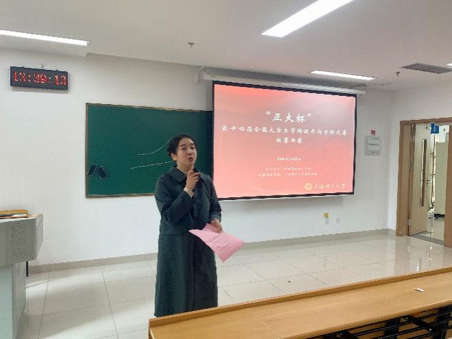 3月29日下午,由中国商业统计学会主办,上海理工大学管理学院承办的“正大杯”第十四届全国大学生市场调查与分析大赛上海理工大学校内选拔赛举办。选拔赛决赛邀请了同济大学市场营销系助理研究员姜辉,上海理工大学管理学院公共管理系副主任范伟、工商管理系青年教师唐青青、会计系青年教师宋鑫担任评委。选拔赛决赛由工商管理系副主任周洋主持。