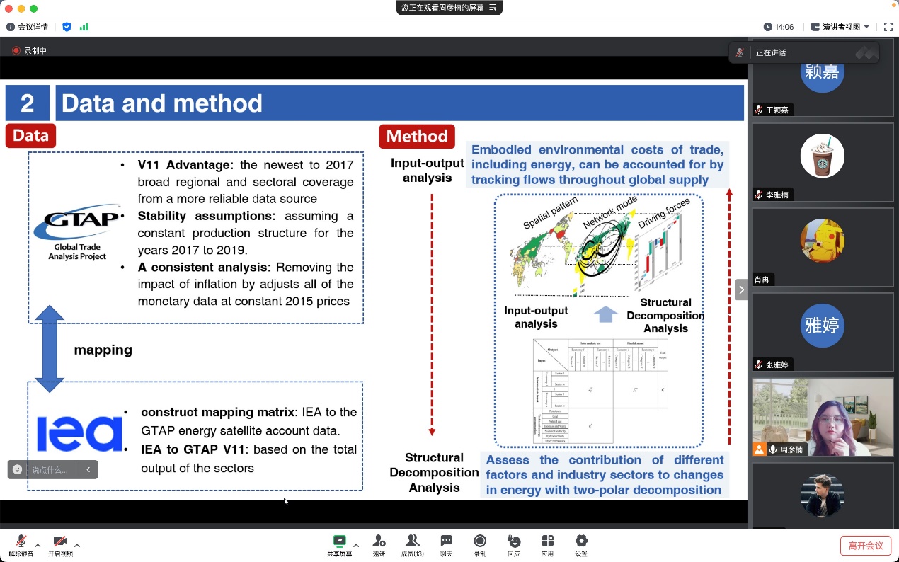 讲座从隐含能源基本概念入手,深入剖析隐含能源转移在全球能源转型中的重要性。其后,周彦楠详细讲解了如何利用国际间投入产出表和国际能源署数据库构建贸易隐含能源的全球转移矩阵,进而揭示全球隐含能源贸易转移网络的复杂结构。随后,周彦楠进一步将隐含能源贸易网络与传统能源贸易的网络进行对比叠加分析。通过这种对比,揭示两种能源流动模式之间的差异,并剖析它们在全球能源流动中的各自作用。此外,周彦楠还详细介绍了结构分解分析方法在解析隐含能源流动空间模式变化驱动力方面的应用。她通过这一方法,深入剖析了各种因素如何影响全球隐含能源的流动,以及这些因素之间如何相互作用,共同推动全球隐含能源流动模式的转变。最后,工业工程系讲师王颖嘉对周彦楠的报告进行了深入的点评和总结。