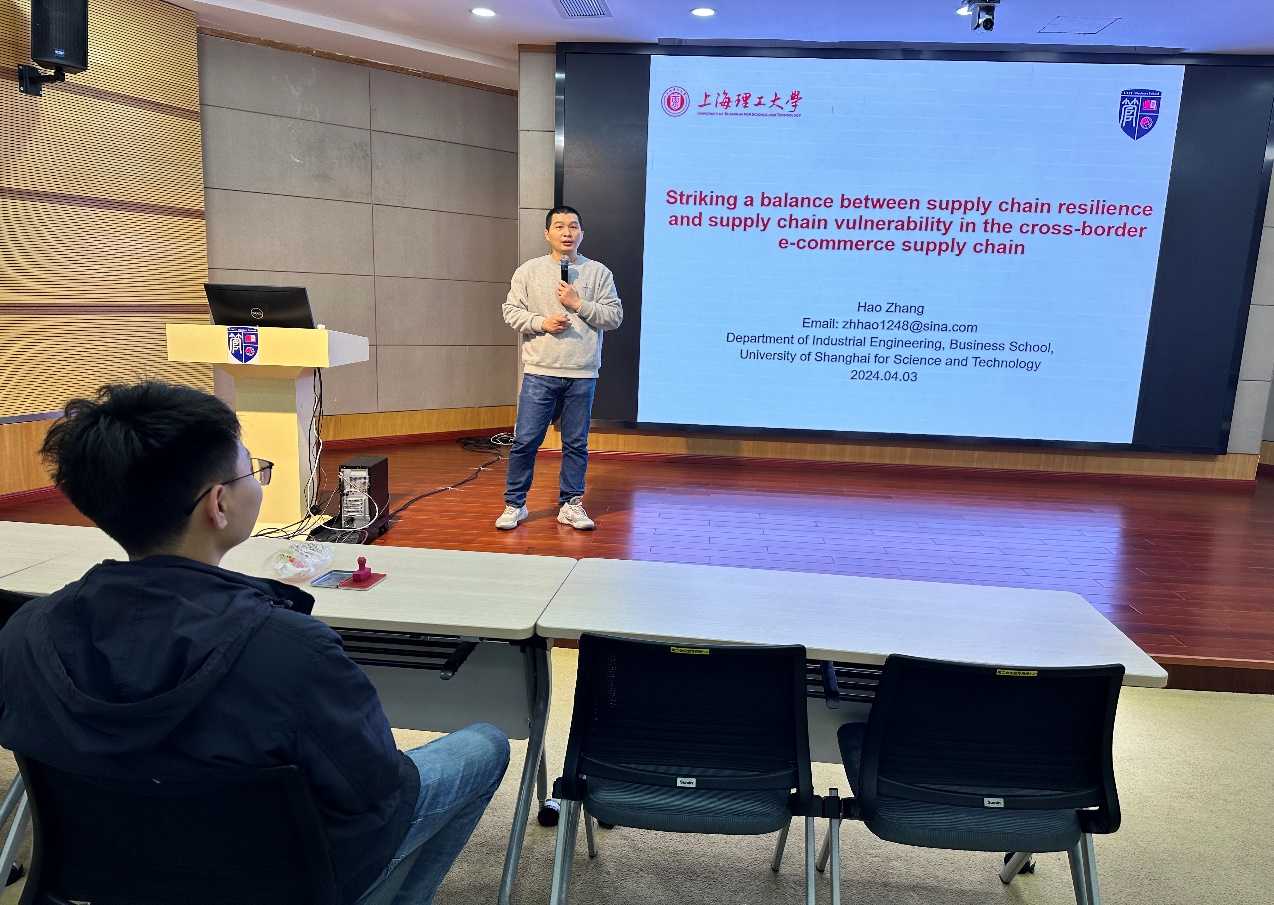 4月3日,沪江经管论坛系列活动(第95期)之青年学术沙龙在经管大楼A楼四楼第二会议室报告厅举行。工业工程系讲师张浩进行了题为“跨境电商供应链如何平衡韧性与脆弱性”的学术报告。管理学院相关学科30余名师生参加了此次报告。