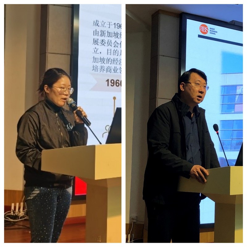 新加坡管理学院华东区主任王佳黎重点介绍了与我院正式签署的硕士合作协议项目,以及面向我院学生的优惠措施和条件。法国布雷斯特高等商学院北京留学基地负责人孙天宝重点介绍了面向我院学生的双学位项目以及相应优待政策。