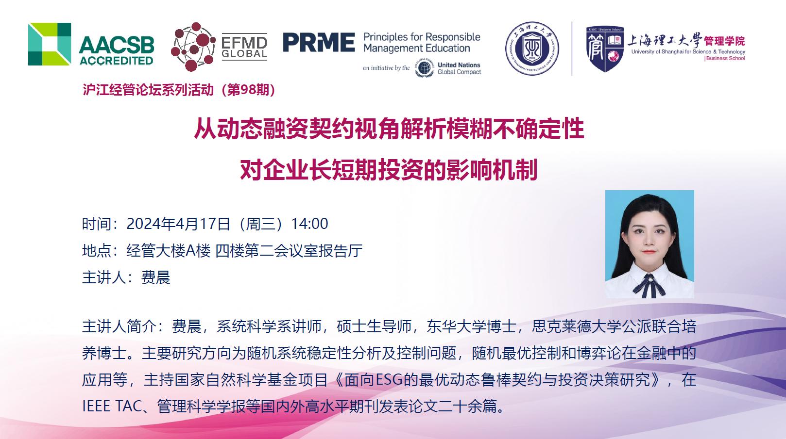 沪江经管论坛系列活动(第98期):从动态融资契约视角解析模糊不确定性对企业长短期投资的影响机制