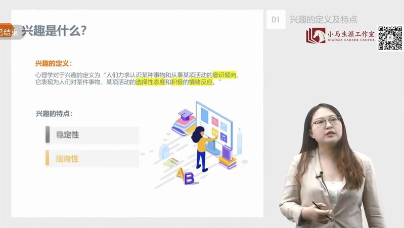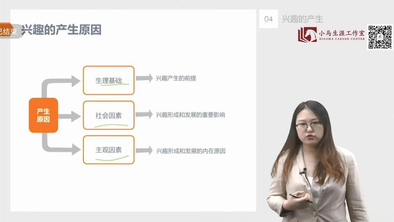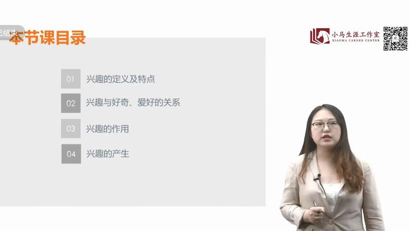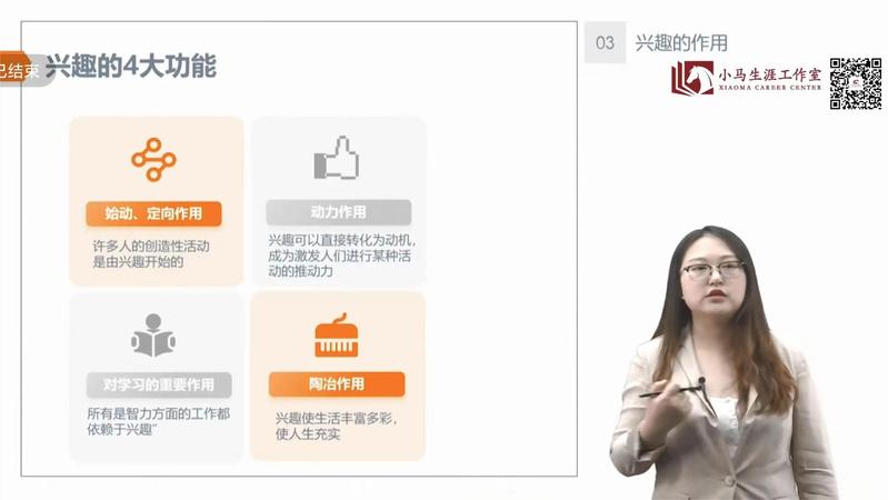 本次录播课的主题是“发展你的兴趣爱好”,课程划分为四个模块:兴趣的缘起及主要作用、如何探索自己兴趣、如何发展自己的兴趣和职业兴趣,以逻辑顺序展开阐述。以第一模块为例,老师阐述了兴趣的定义为一种意识倾向,表现为一种选择性态度和积极的情绪反应,解析了兴趣的特点,与好奇、爱好各自的联系与区别,以及兴趣的四大功能和其产生的多个原因,最后回顾了本节课的核心要点。以兴趣的相关概念为铺垫,老师进而讲解后续课程,运用科学的分析和形象的例子阐明了主题,助力大家了解自身并将兴趣运用至职业中。