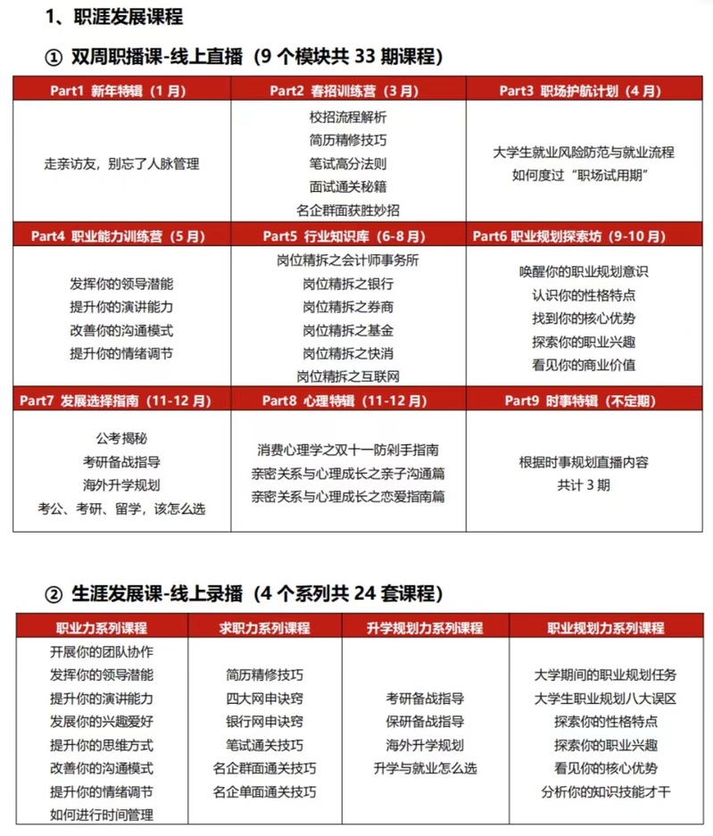 课程聚焦大学生职业生涯发展,长期开展,分为两类课程。双周职播课-线上直播包含新年特辑、春招训练营、职场护航计划、职业能力训练营、行业知识库、职业规划探索坊、发展选择指南、心理特辑和实事特辑9个模块共33期课程,全面帮助学生培育职场能力,提升专业素养。