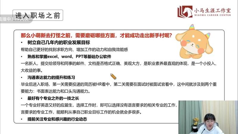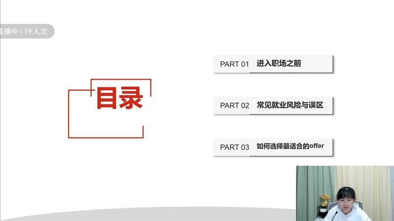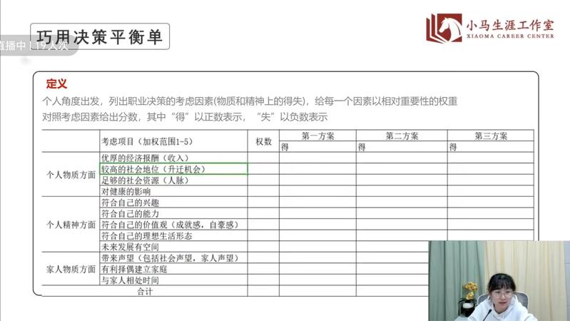 本次直播课的主题是“大学生就业风险防范与就业准备”,老师将内容划分成了三部分:进入职场之前、常见就业风险与误区和如何选择最合适的offer。第一部分包括心态的转换、目标的树立和能力的提升,第二部分汇总了应届生的诸多求职陷阱与误区,第三部分由兴趣引出对职业价值观的介绍,最后运用了决策平衡单这一工具来辅助大家权衡职业决策,从而选出最佳offer。