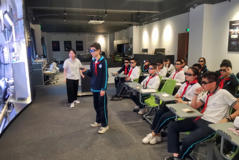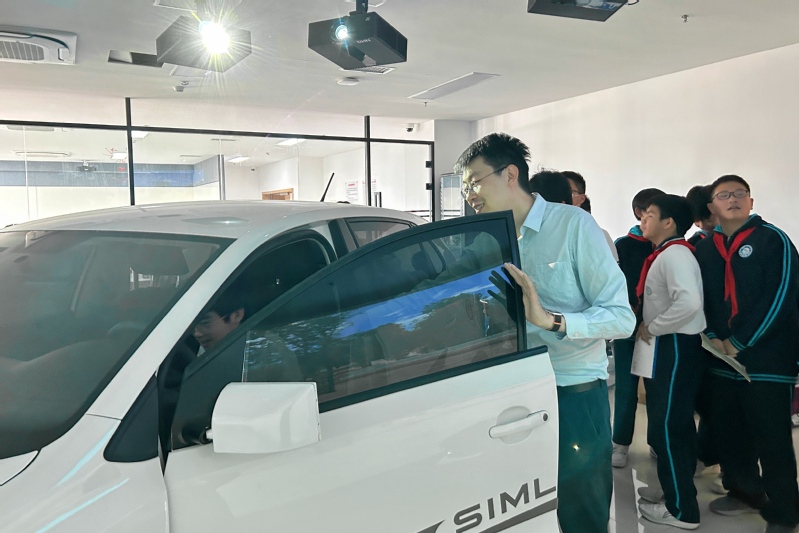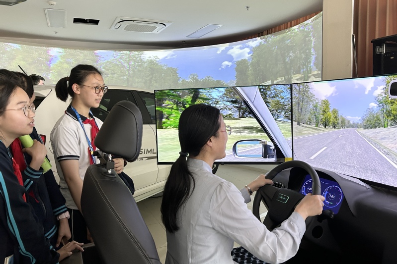 接着,王嘉文带同学分组前往交通系统工程基地开展智能交通、自动驾驶、交通安全方面的劳动教育暨科普实践。同学们逐一体验了三自由驾驶模拟系统及双车交互驾驶实验平台。