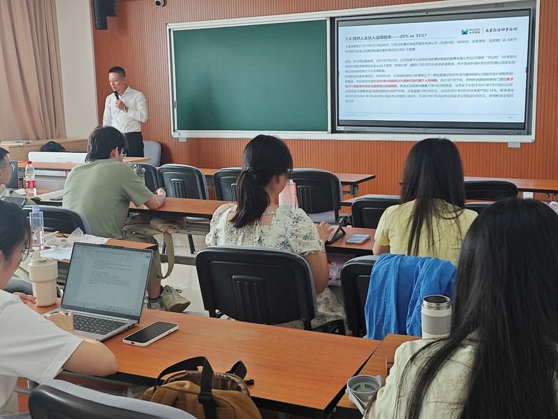之后,邢立鹏将私募基金与公募基金对比,分析出私募基金对税收与法律合规性的重视程度不足,存在更大的税收征管盲区,随着私募基金市场快速增长和金税四期的实施,防范私募基金可能面临的税收风险迫在眉睫。接下来,他依次讨论了进项转出的税务争议、私募基金管理人超额收益的税务处理、个人或公司作为投资人从私募证券投资基金取得的分红收入是否涉税、合伙型私募基金转让限售股是否缴纳增值税、法人合伙人取得的“间接分红”是否免税、合伙企业留存利润的税务风险等话题。此外,他还向同学们介绍了QDLP架构的税务处理,丰富了同学们对于海外LP投资人属性界定及协定待遇的相关知识。
