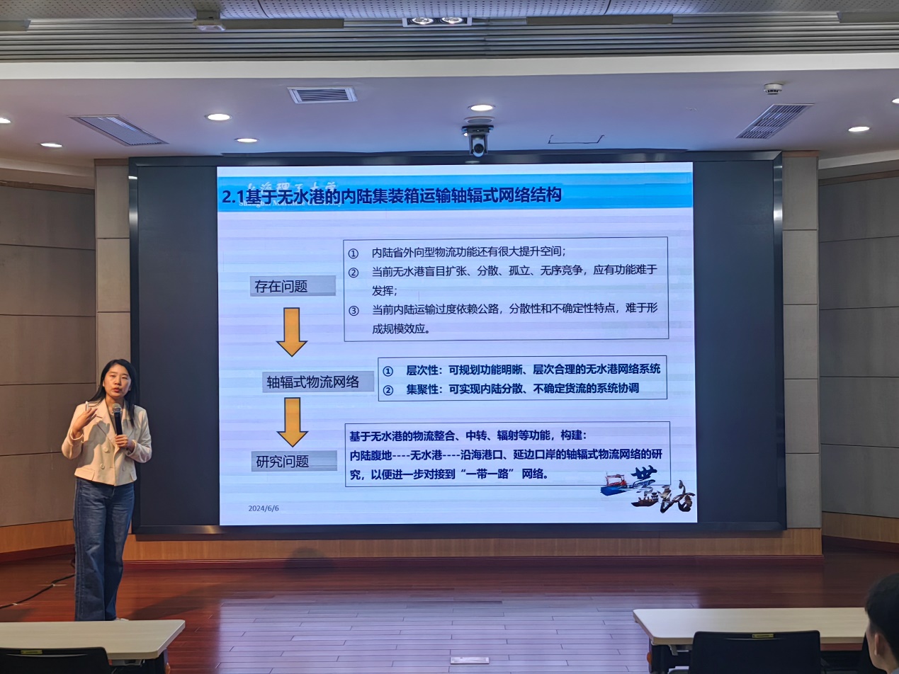 讲座中,魏海蕊介绍了中欧班列的开通、发展历程,无水港(国际陆港)在中欧班列开通中发挥的重要作用,进而介绍了无水港的扩张和中欧班列开通运营的现状、特征与存在的问题,在此基础上提出以无水港平台为核心的中欧班列跨境物流网络优化问题,详细阐述了中欧班列跨境轴辐式物流网络两阶段物流引力设计方法与模型,接着进一步阐述了实例分析部分,以国内17个内陆省内的196个地级腹地为实例的分析与研究,并分析了研究结论对现实跨境物流网络发展的建议与启示等内容。最后,为中欧班列跨境物流网络进一步研究关注因素和协同运营问题的提出进行了简要介绍,为研究生围绕现实问题进行科学研究选题与研究提供了有益启发。