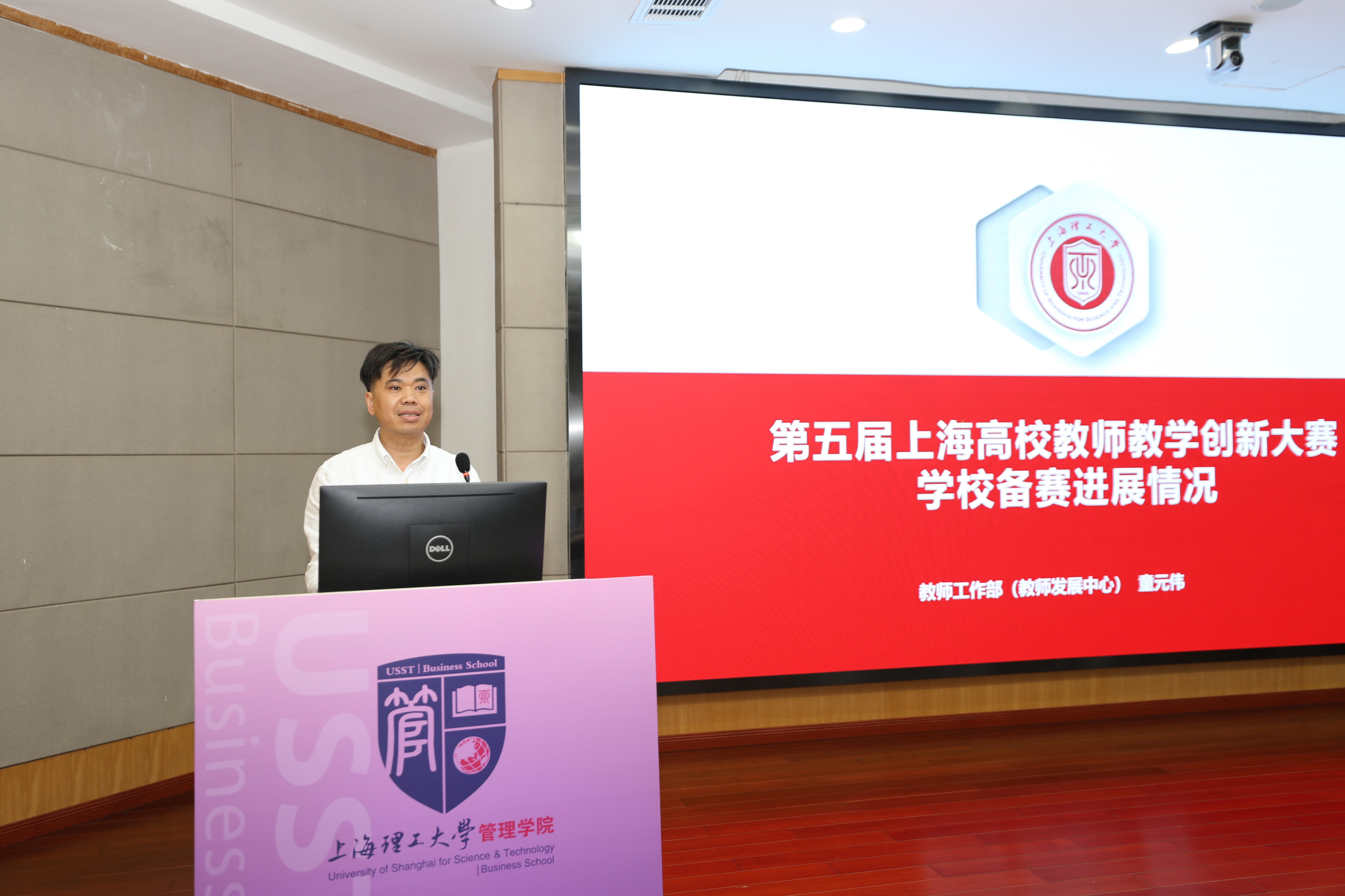 童元伟详细介绍了学校前四届高校教师教学创新大赛情况、教师教学创新大赛分组及赛事评分标准、第五届上海市高校教师教学创新大赛备赛进展情况以及参赛材料准备。他表示,管理学院拥有一批教学水平精湛、教学经验丰富的优秀教师,欢迎广大教师积极参加高校教师教学创新大赛。