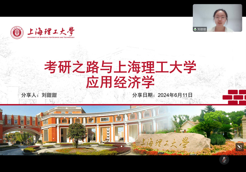 接下来,应用经济学学硕和国际商务专硕二年级的学生代表刘甜甜和张毓颖同学进行分享。她们结合自己的本科经历介绍了自己选择上海理工大学的理由,并通过自身在校学习和生活感受,介绍了自己入学后成长和收获。她们表示,上海理工大学拥有丰富的学术资源和良好的研究氛围,教师团队学术背景丰富、授课风格生动,为她提供了坚实的学习平台和广阔的发展空间,鼓励学弟学妹们积极报考上海理工大学。