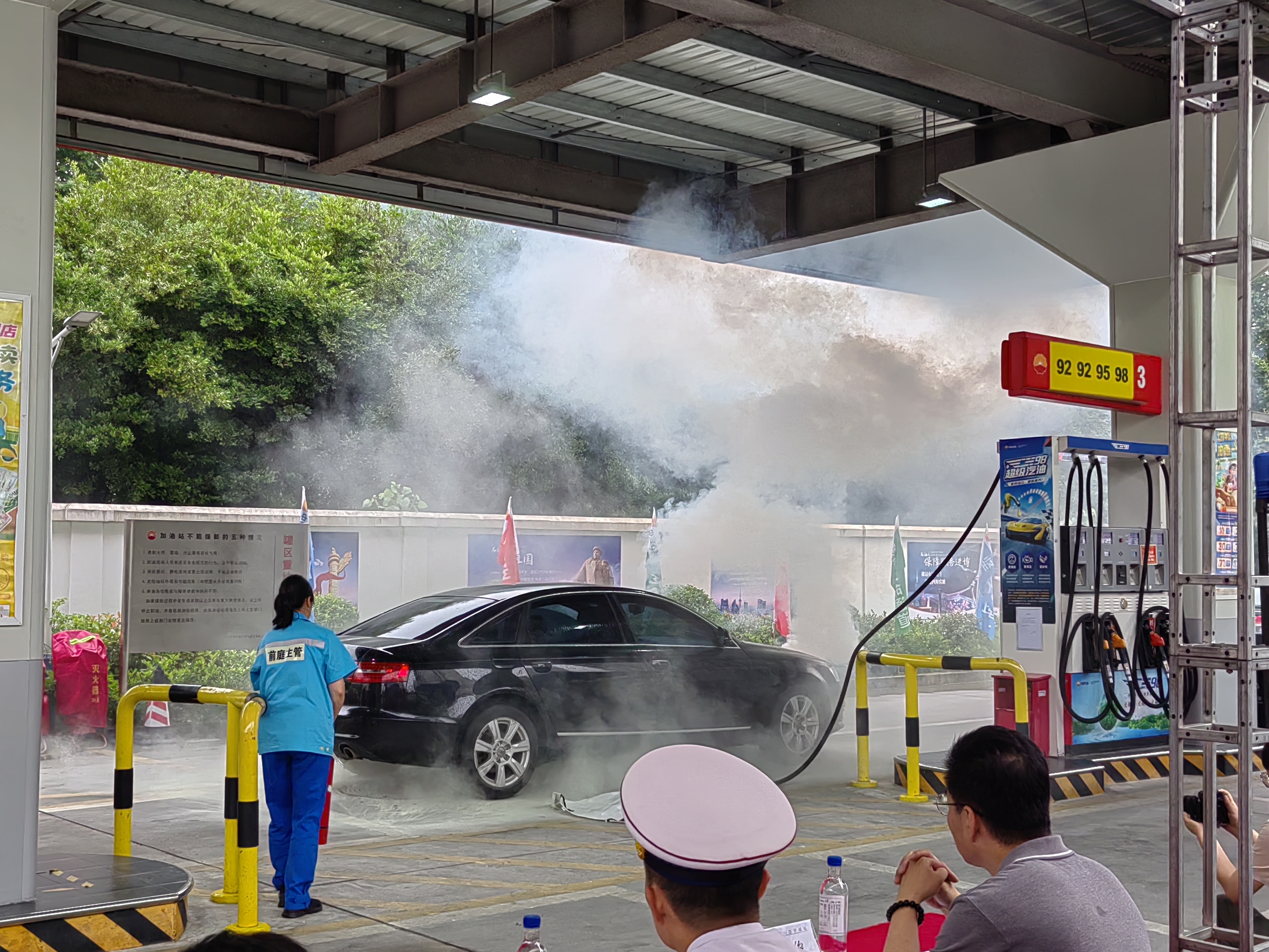 揭牌仪式开始前,加油站开展了突发火灾应急预案演练,演练人员模拟加油作业起火环境,在场员工按照应急预案规范分工协作、有条不紊进行现场灭火处置,疏散现场顾客,同时拨打119报警电话请求消防支援,随即消防车到达现场扑灭火情。