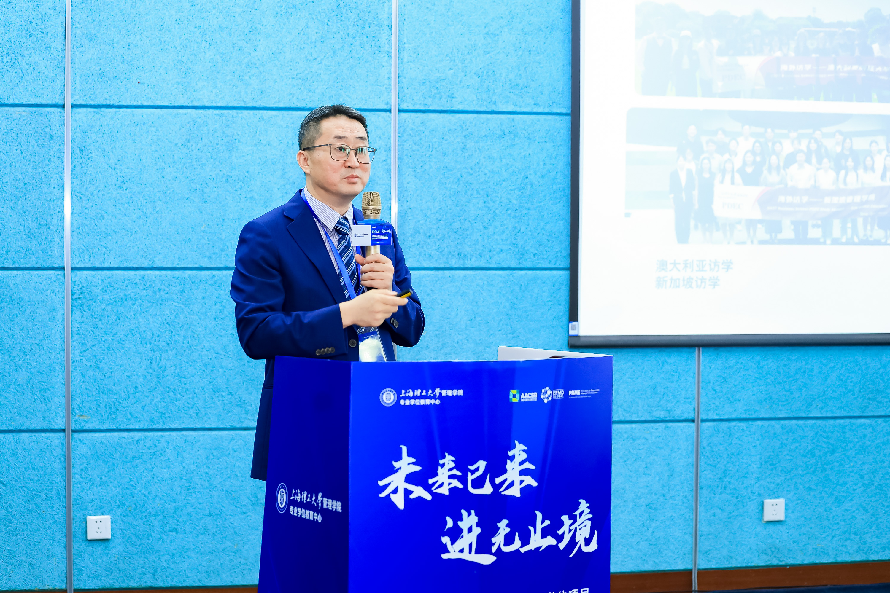 赵来军在致辞中回顾了学院从2002年MBA教育中心起步,到如今“4+3+2”(7M9个专业学位)大中心的辉煌发展,彰显了学院引领“多学科交叉融合”的办学特色。他表示,在新一轮科技革命和产业变革纵深推进的当下,要以服务国家“加快发展新质生产力”的战略部署为己任,促进科技创新与经济社会的深度融合,在改革创新中大力推动经济社会高质量发展,学院将持续优化人才培养体系,强化实践教学,培养既有理论又具实操能力的复合型人才,坚持以“开放协同”为抓手,继续深化国际交流,拓宽教育资源,助力学生实现个人梦想与社会价值,鼓励每位同学珍惜机会,积极参与,不懈奋斗。