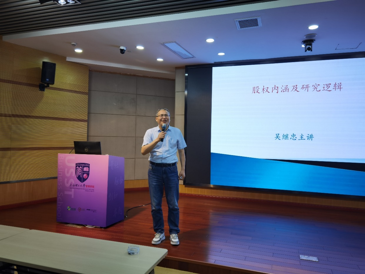 上海理工大学管理学院工商管理系副教授、东方卫视第一财经主讲嘉宾吴继忠分享了题《股权内涵与研究逻辑》的学术讲座。他依据多年的股权治理的研究和咨询经验,引经据典,厘清了清股权背后的秘密和本质逻辑关系,详细阐述了股权的重要作用。