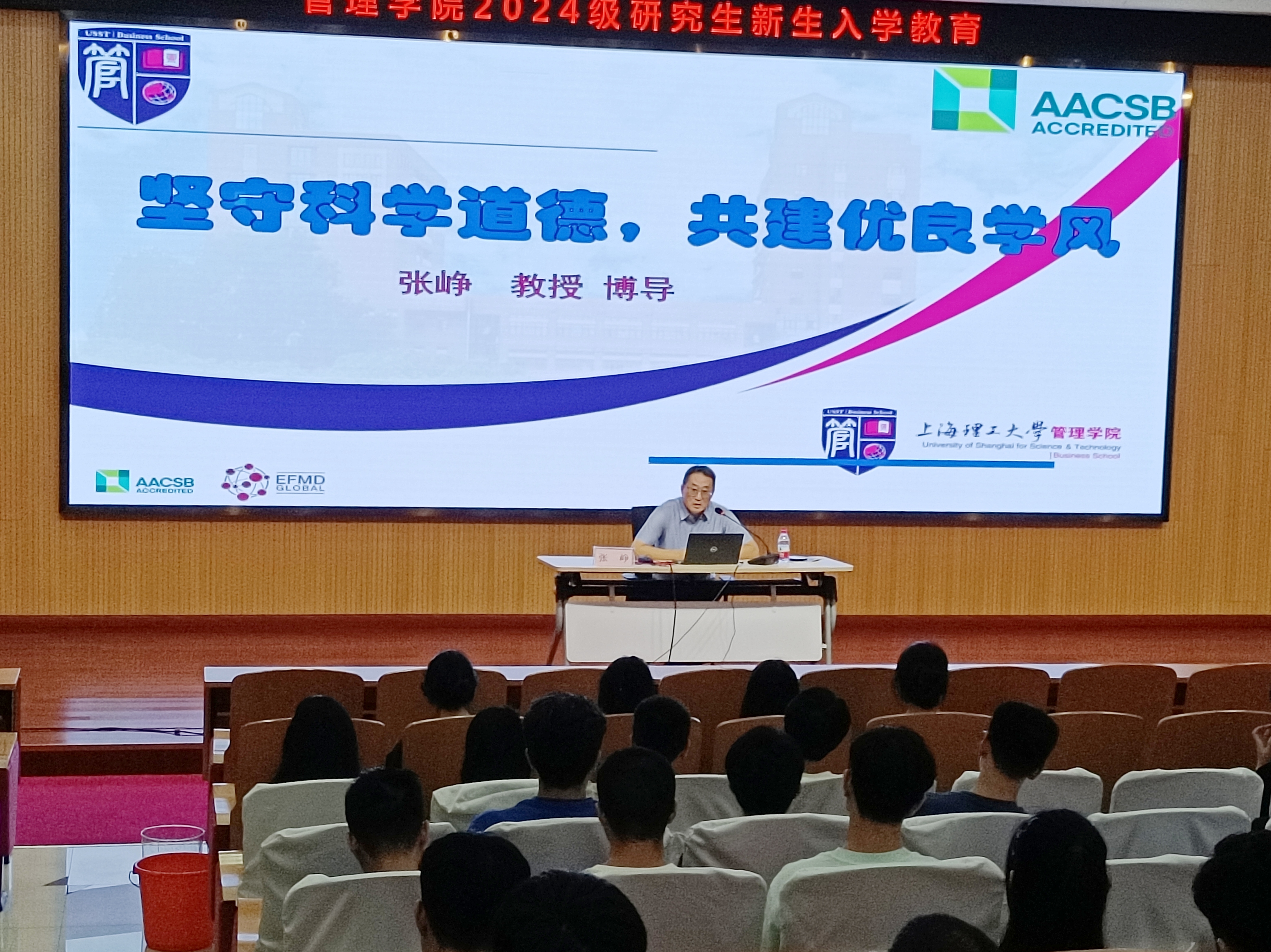 在“科研教育第一课”上,管理学院副院长张峥从如何规划研究生学习生活规划、科学道德与学风建设、主要学术不端行为、危害与成果、我们怎么办五个方面,为新生作了一场引人入胜的展示,并与现场同学热烈交流。张峥以丰富的学识和深刻的见解,为新生们勾勒出科学研究的广阔蓝图,激发了同学们对学术探索的热情和向往,同学们全神贯注,随着他的思路展开热烈讨论,讲座最后,张峥介绍了几种主要学术不端行为及其危害和成因,并列举了学术不端的事件提醒同学们引以为戒。