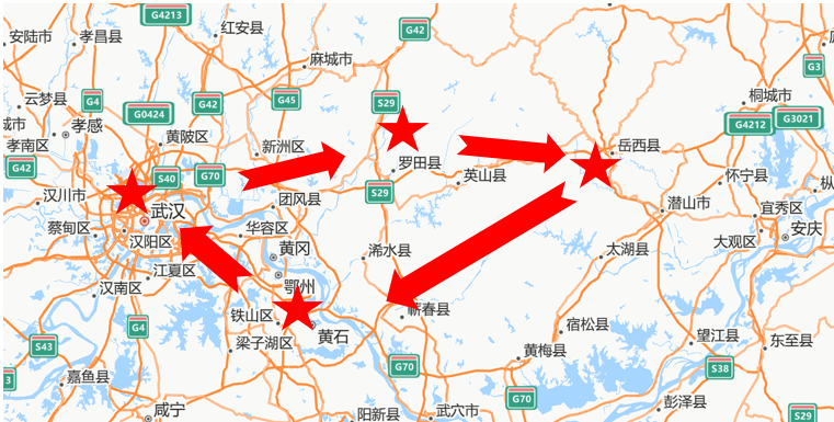 红色研学路线:上海—>武汉—>鄂皖交界大别山革命老区。