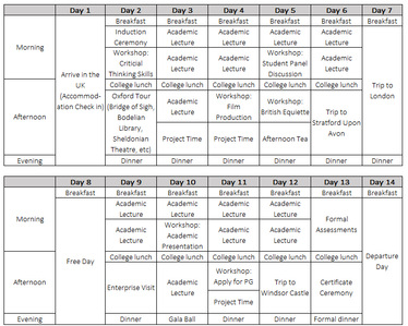 课程由:1. 跨学科学术课程; 2. 学术实践工作坊; 3. 行业特邀嘉宾讲座; 4. 英国企业参访; 5. 英式社交拓展; 6. 英伦文化体验;等六部分组成。