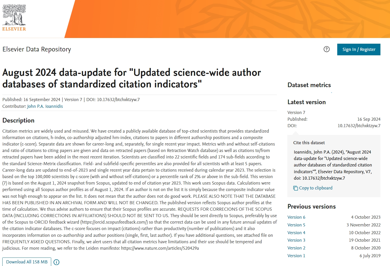 【爱思唯尔(Elsevier)发布第七版全球前2%顶尖科学家榜单】https://elsevier.digitalcommonsdata.com/datasets/btchxktzyw/7