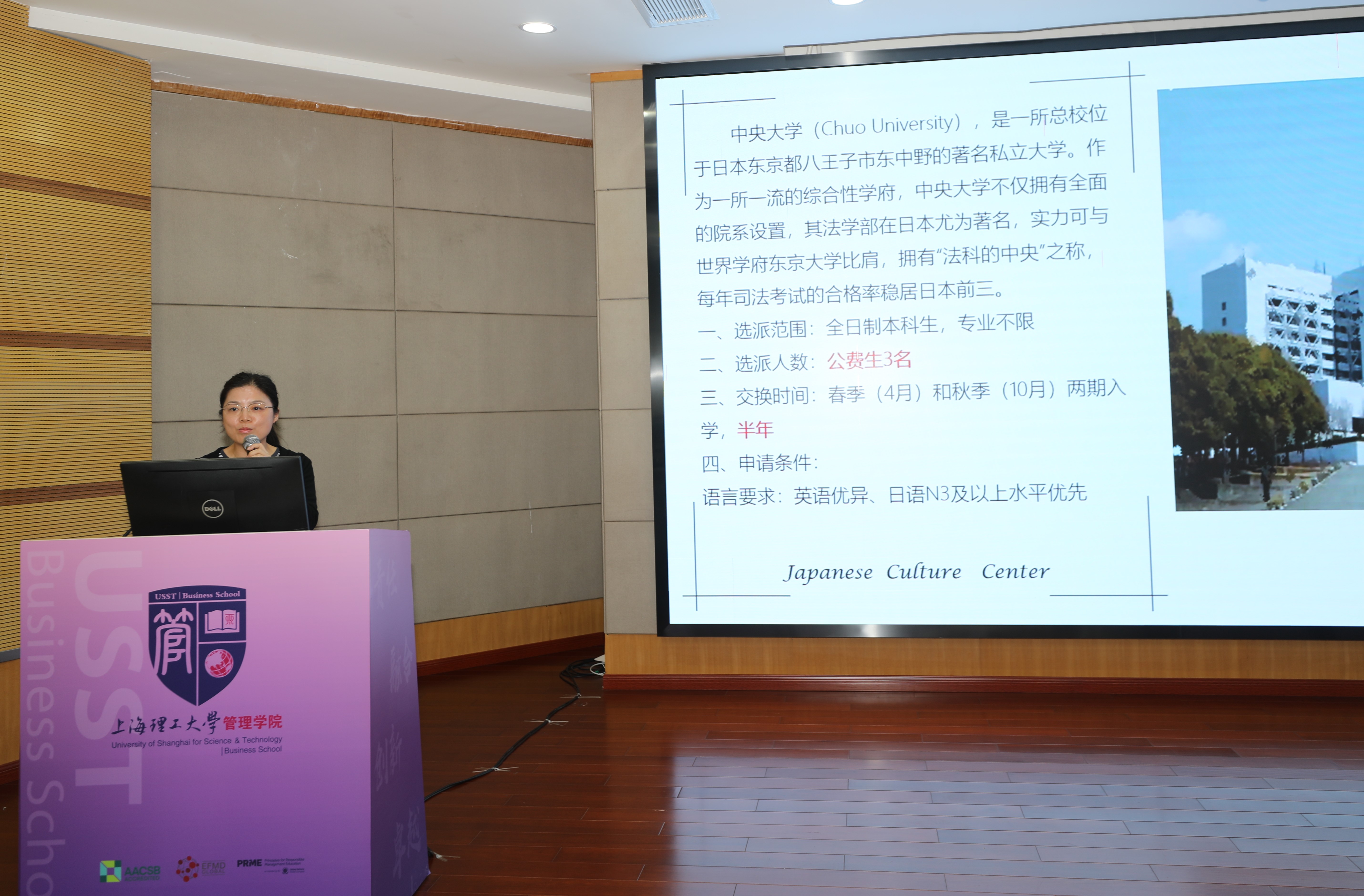 国交处国际交流科科长刘媛对我校交换项目的项目发布周期、报名条件、项目内容、申请流程,以及海外学习资助等方面进行了详尽介绍。沪江国际文化园综合办主任罗锐佳介绍了日本交换交流项目及海外短期访学项目的申报时间、申报条件、申报流程等具体信息。