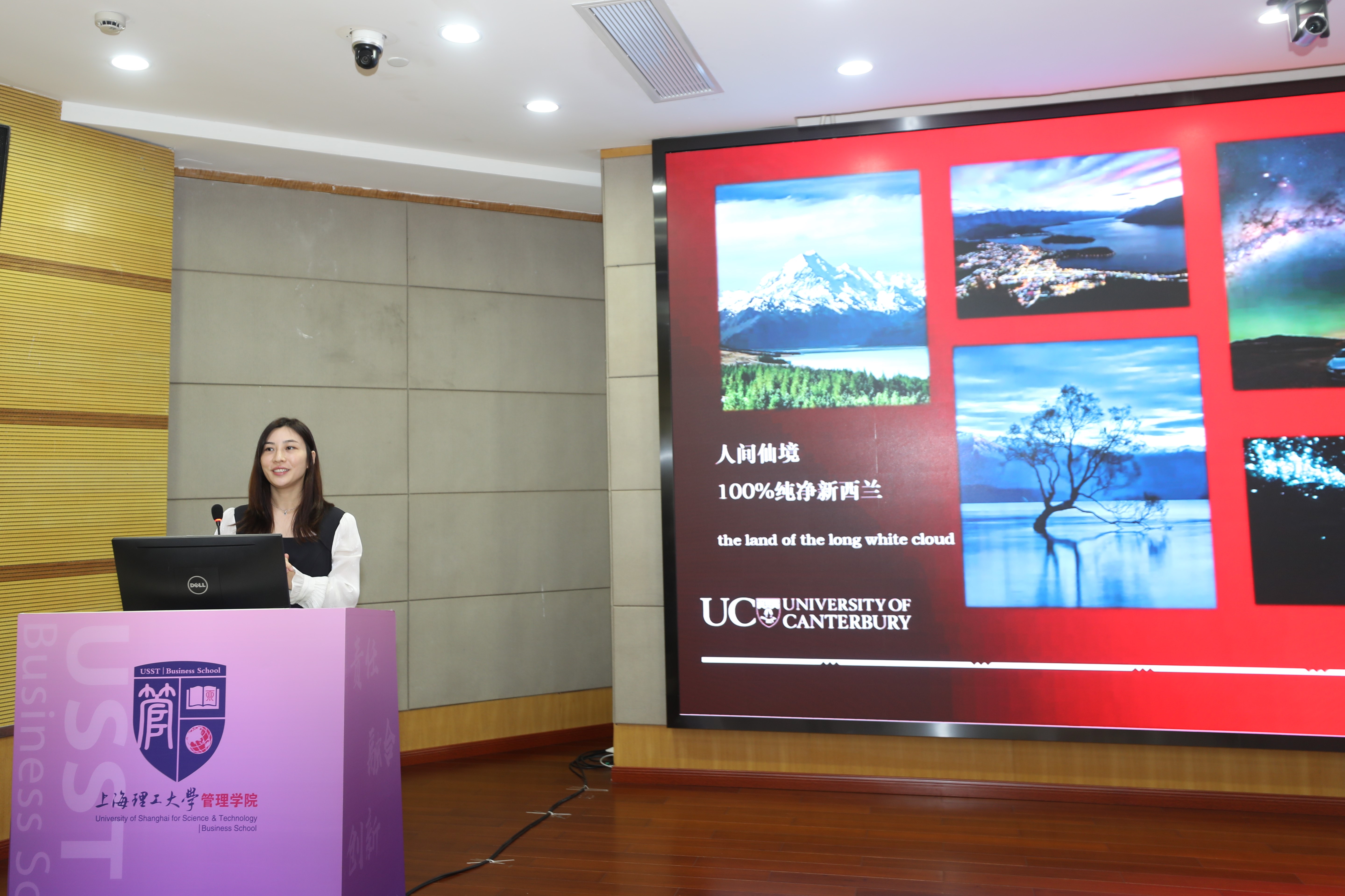 新加坡管理学院华东区合作项目经理张婷婷介绍了新加坡管理学院的具体概况并具体说明了与我校签署的合作协议中的具体招生条件、学业安排、毕业要求等。新西兰坎特伯雷大学上海项目协调办公室项目负责人胡伟平对坎特伯雷大学的概况、短期访学规划进行了详细介绍。