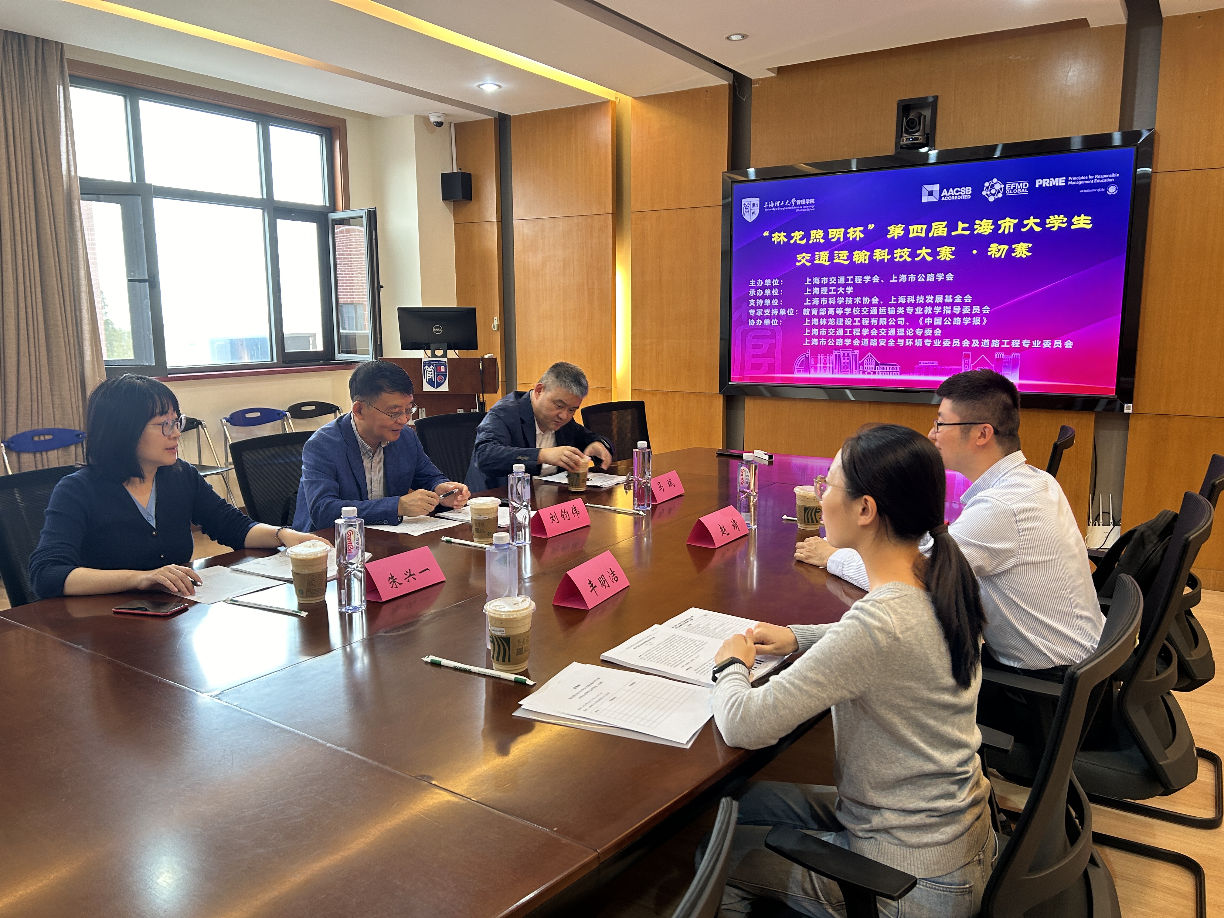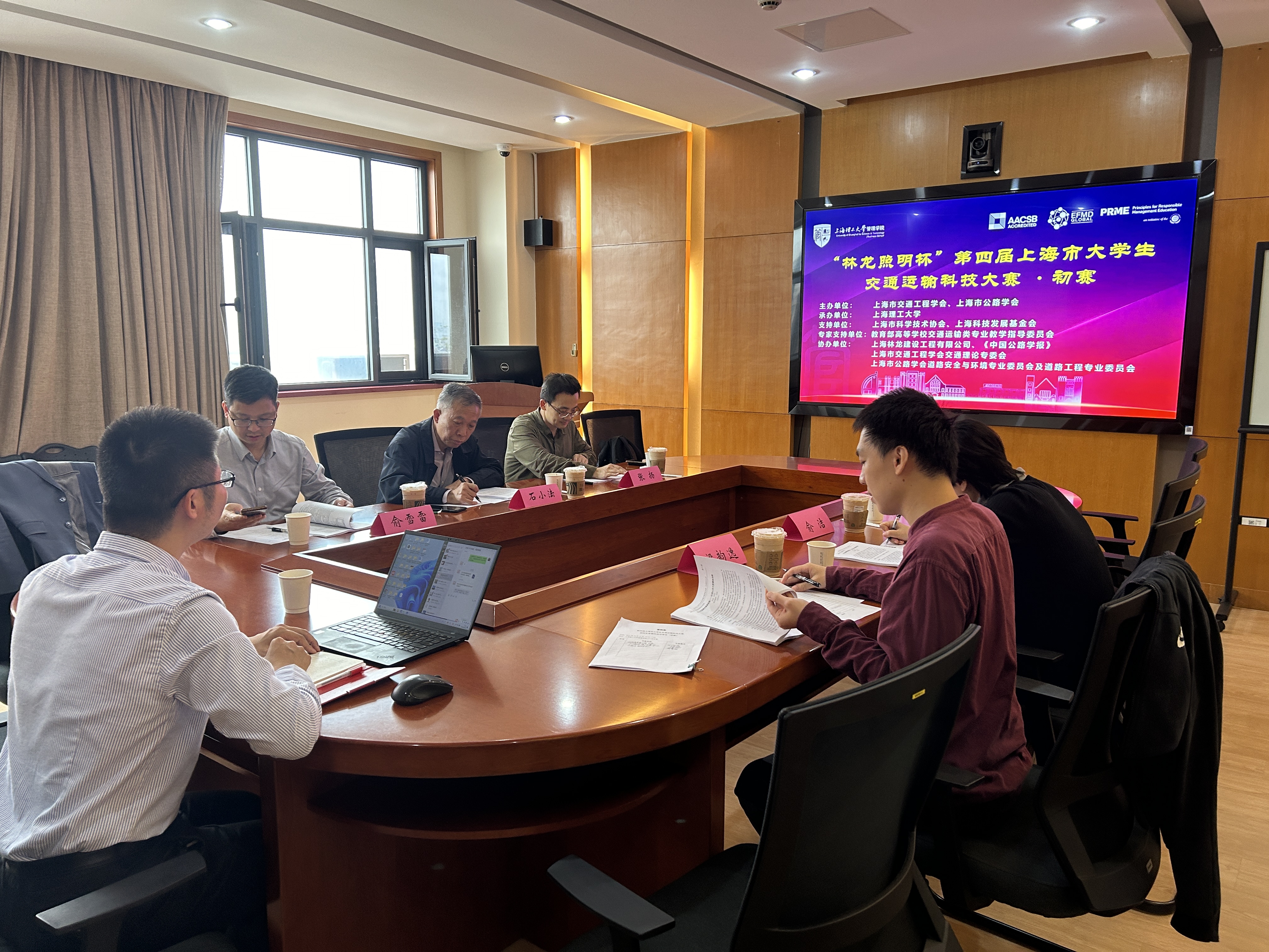 上海市公路学会副理事长兼秘书长刘钧伟,上海市交通工程学会副秘书长石小法,同济大学交通学院副院长朱兴一,上海市城市建设设计研究总院(集团)有限公司智慧城市院院长马斌,上海市城乡建设和交通发展研究院智慧交通发展中心副主任张扬,上海城市交通设计院有限公司副院长俞雪雷,上海理工大学管理学院副院长赵靖,上海理工大学管理学院教师俞洁、梁韵逸和丰明洁出席大赛初评会议,担任参赛作品的评审专家。