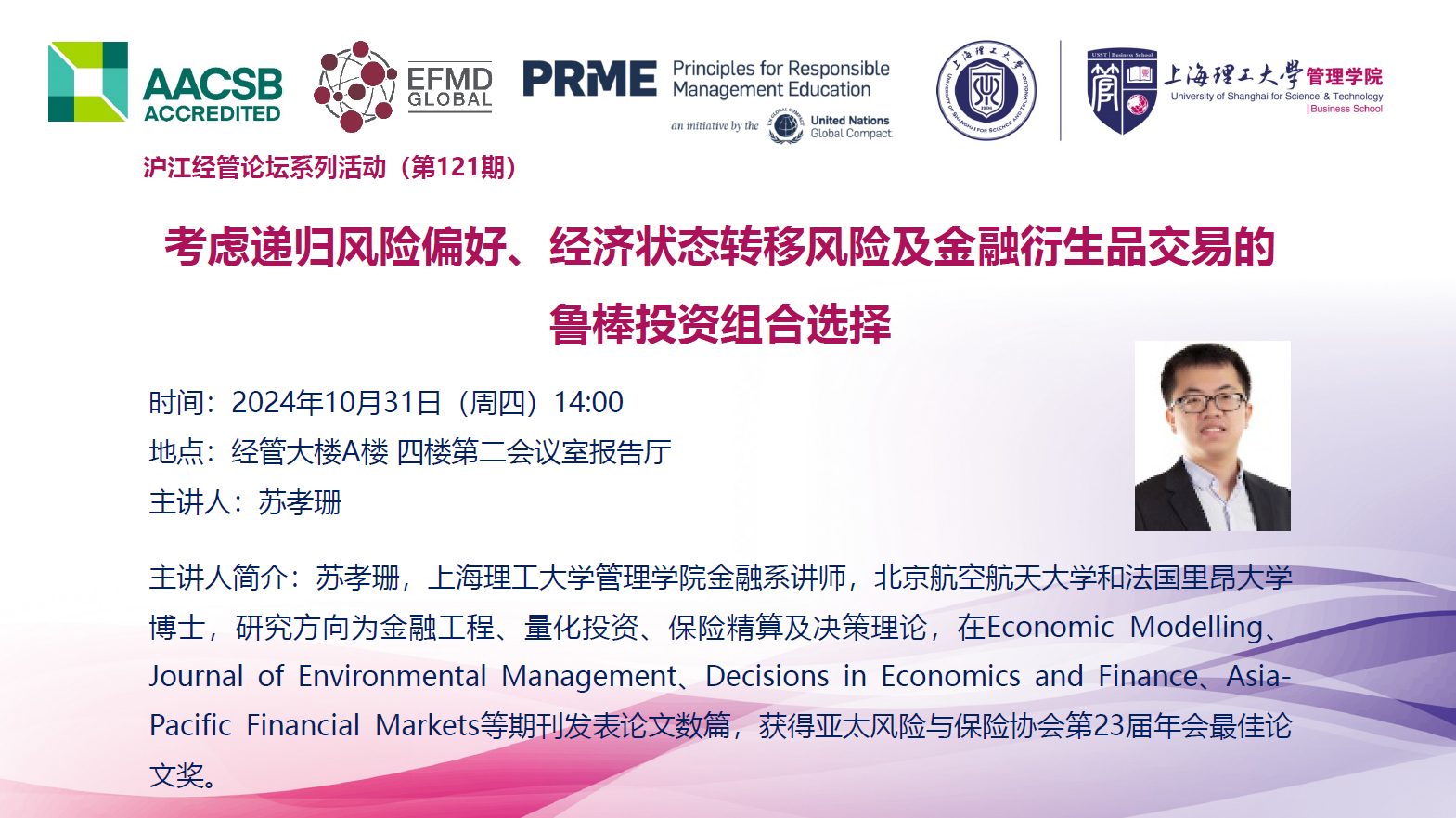 沪江经管论坛系列活动(第121期):考虑递归风险偏好、经济状态转移风险及金融衍生品交易的鲁棒投资组合选择