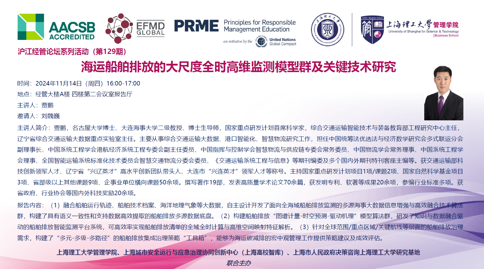 沪江经管论坛系列活动(第129期):海运船舶排放的大尺度全时高维监测模型群及关键技术研究