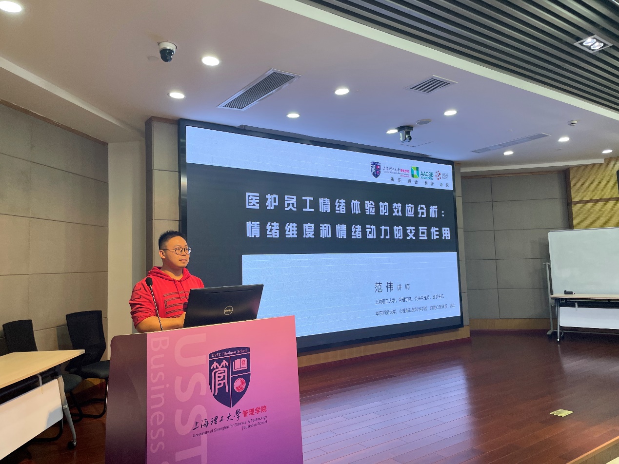 11月12日,沪江经管论坛系列活动(第127期)之青年学术沙龙在管理学院四楼第二会议室报告厅举行。公共管理系青年教师范伟作题为“医护员工情绪体验的效应分析:情绪维度和情绪动力的交互作用”的学术报告。报告会由公共管理系青年教师刘心雨主持,管理学院相关学科师生参加了此次学术沙龙。