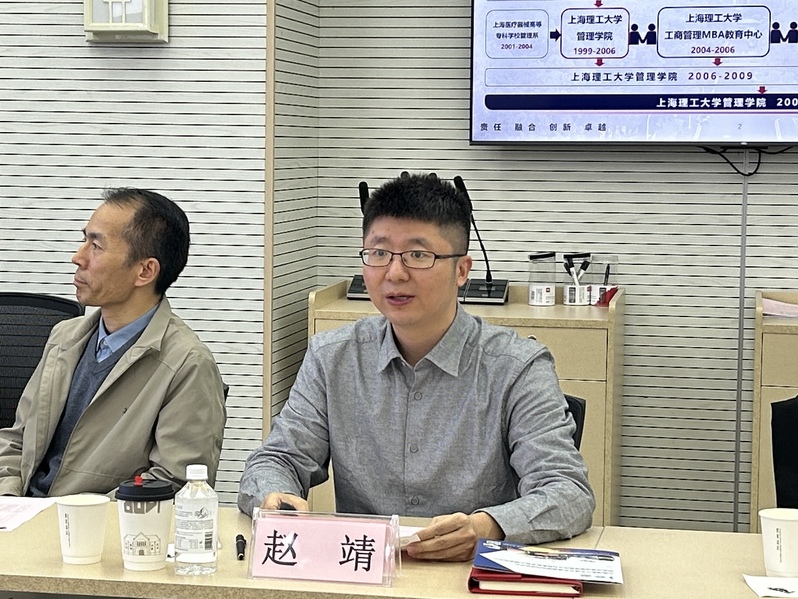 赵靖代表学院对大连海事大学的来访表示热烈欢迎,并从历史沿革、师资队伍、学科建设、国际化建设、国际合作、科学研究、人才培养等方面介绍了管理学院基本情况。