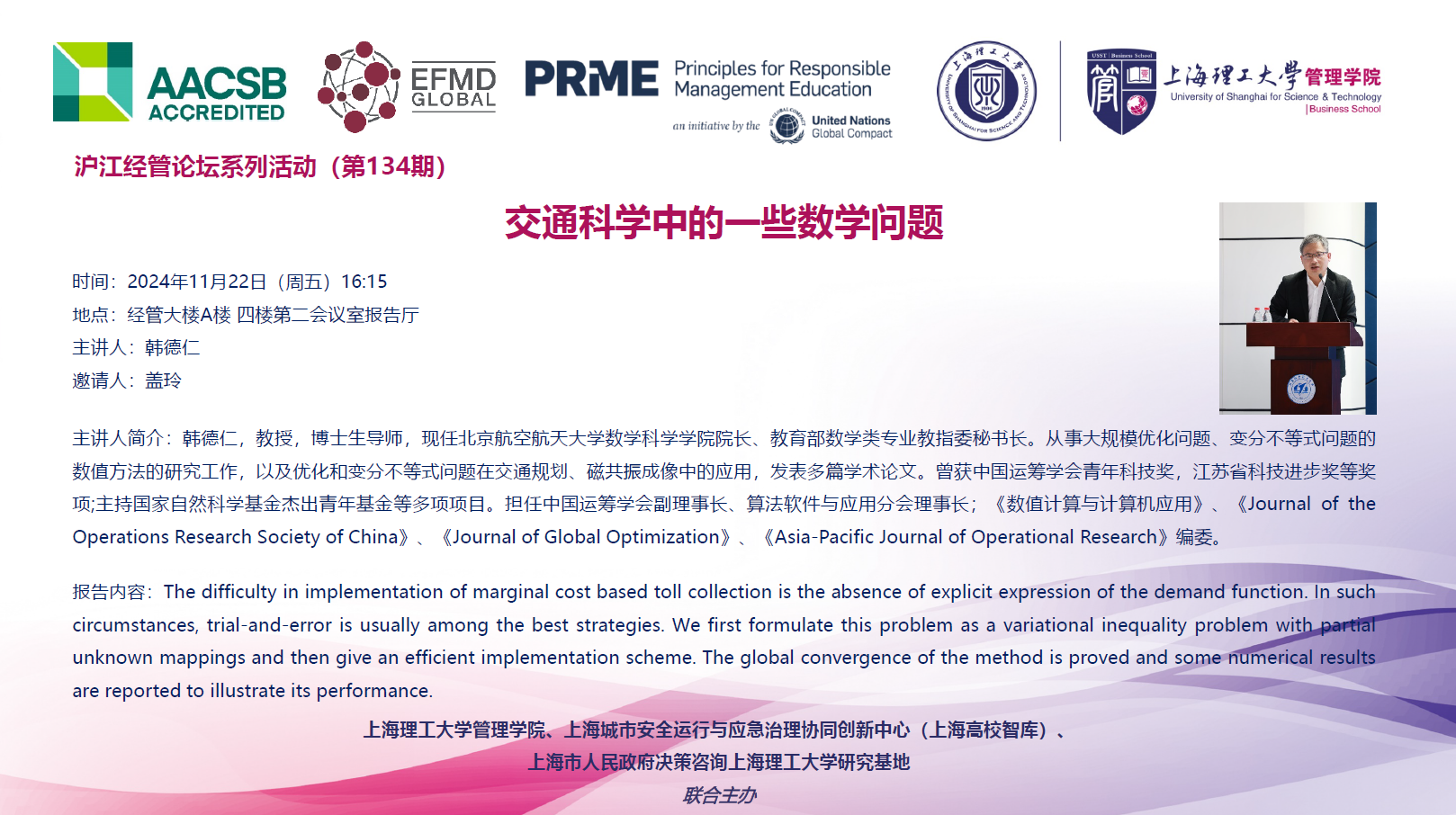 沪江经管论坛系列活动(第134期):交通科学中的一些数学问题
