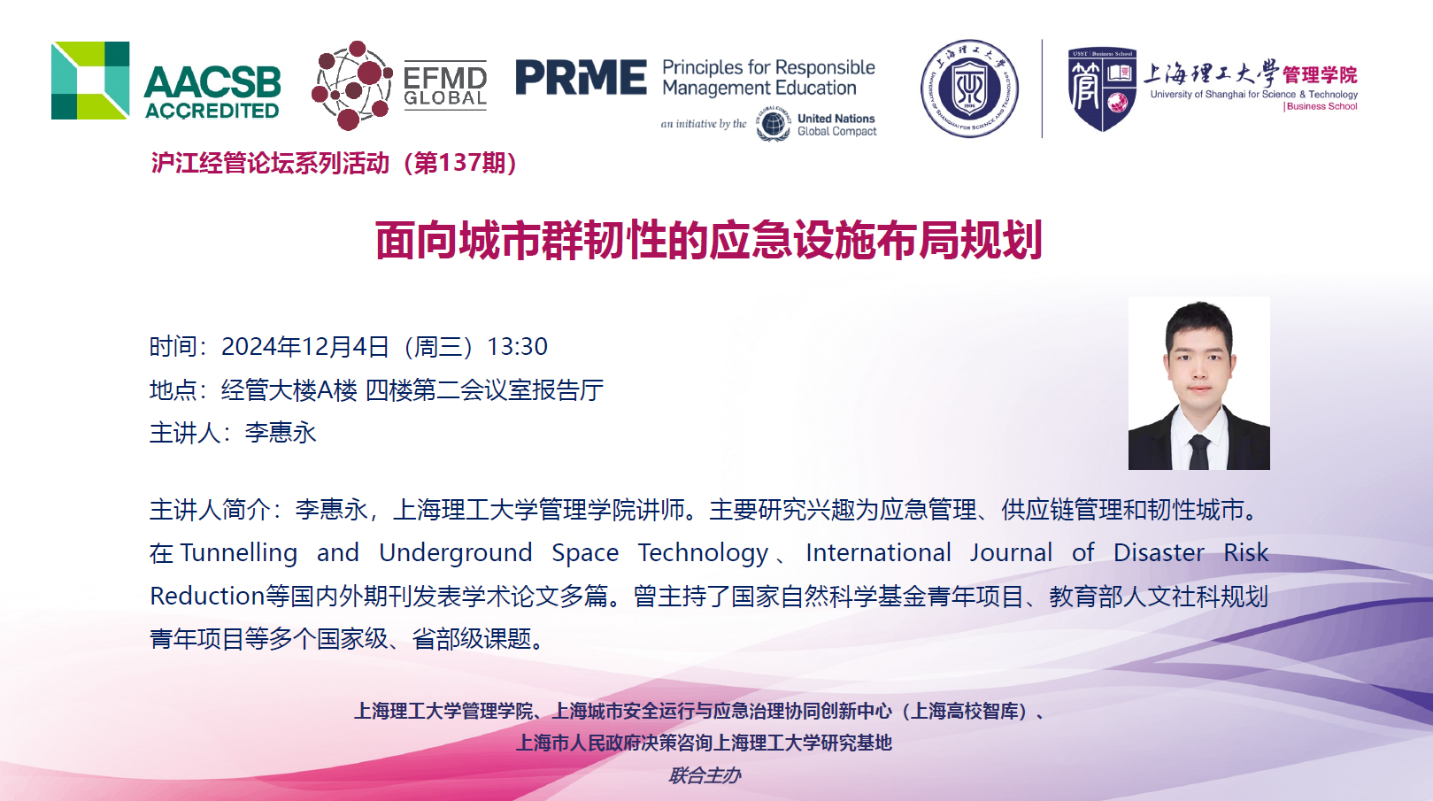沪江经管论坛系列活动(第137期):面向城市群韧性的应急设施布局规划