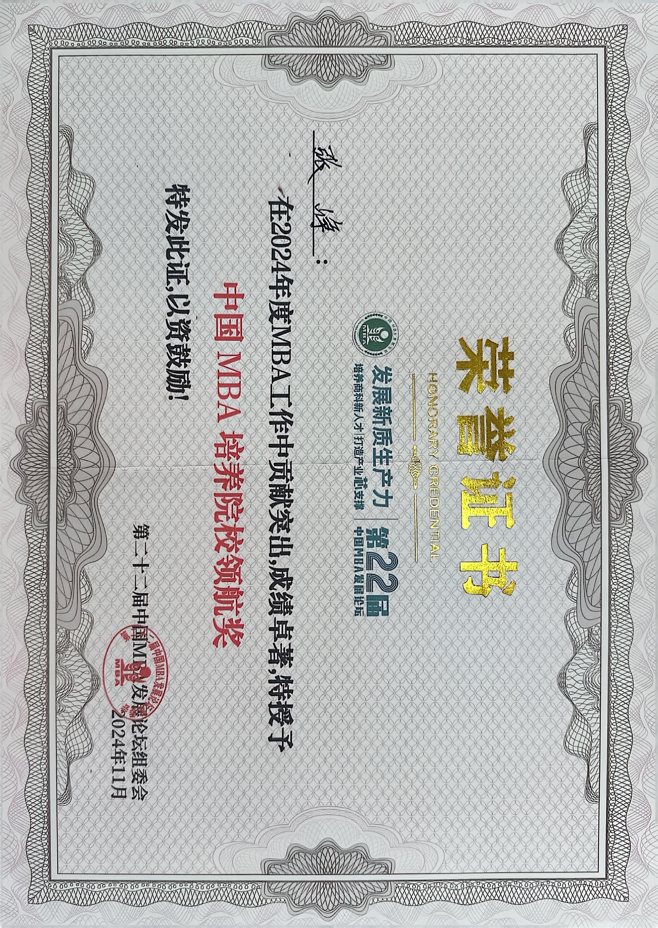 管理学院副院长、专业学位教育中心副主任张峥荣获“2024年度中国MBA培养院校领航奖”,2023级MBA在校生薛杰荣获“2024年度中国MBA校友创新创业新星”,2023级MBA在校生范瑞芳、谢宇鹏分别荣获“2024年度中国MBA新秀100”,2023级MBA在校生张兵荣获“2024年度行业专项活动优秀奖”。