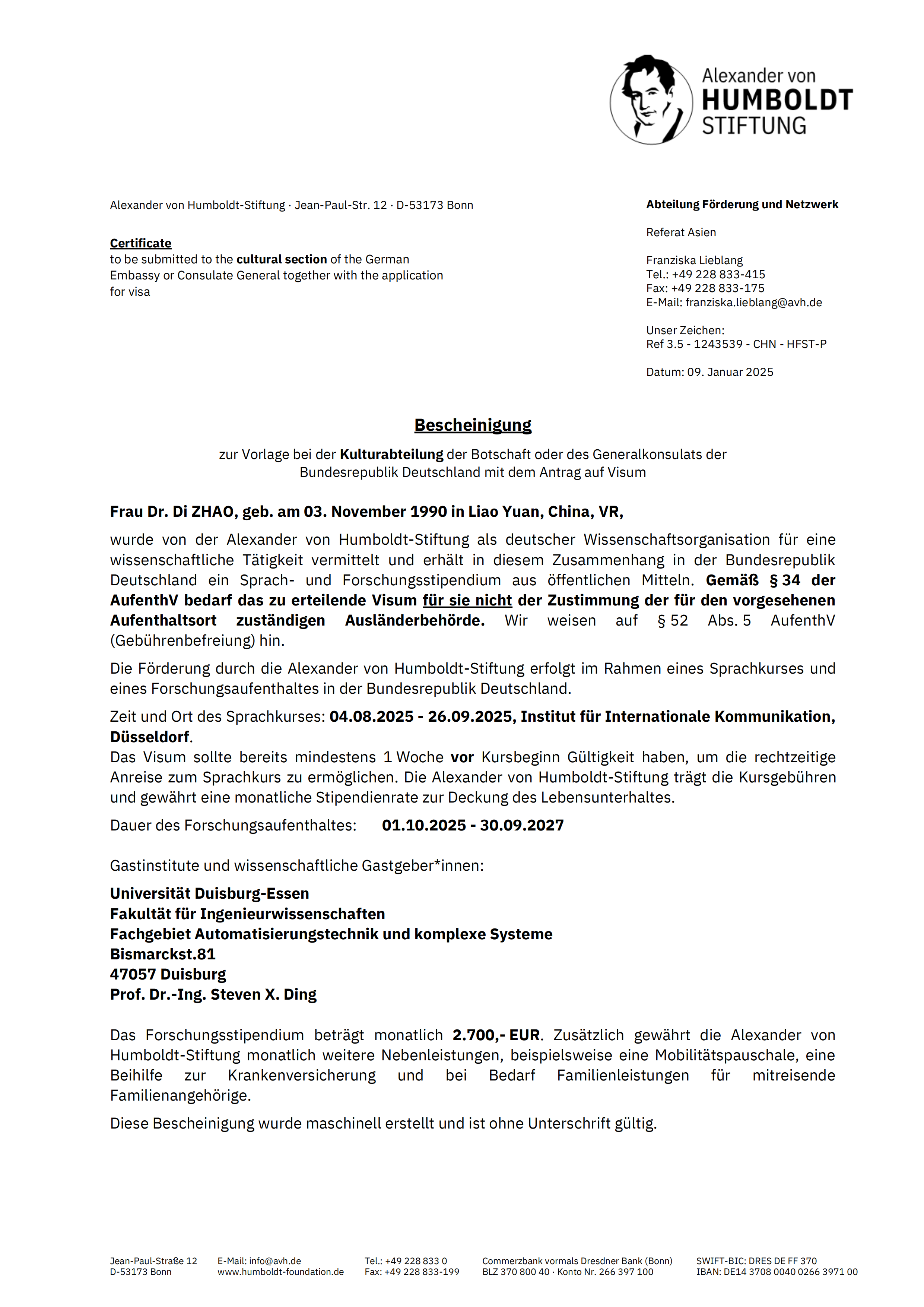 1月9日,德国洪堡基金会(Alexander von Humboldt Foundation)发来正式授权信,管理学院系统科学系副研究员赵迪入选德国洪堡基金会“洪堡学者”,获得德国洪堡基金会资助与“洪堡学者”(Humboldt ResearchFellowship)荣誉称号。该项目的邀请合作方为德国杜伊斯堡-埃森大学(University of Duisburg-Essen)教授Steven X. Ding。