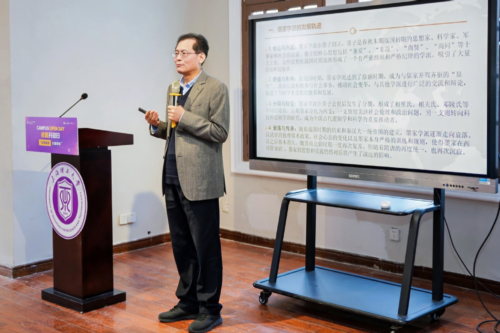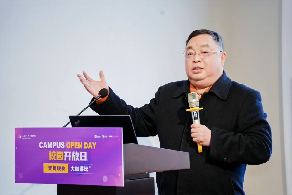 3月9日,由专业学位教育中心与东方管理大讲堂共同打造的“双师联袂·大咖讲坛”校园开放日在上海理工大学复兴路校区举行。本次活动吸引众多校友、在校生、意向考生及管理爱好者齐聚一堂,共同开启一场传统智略与现代管理的思想碰撞之旅。上海理工大学二级教授葛玉辉,复旦大学东方管理研究院学者王国进出席活动并作报告。中心综合办公室主任孟陈莉,上海管理教育学会秘书长苏宗伟,上海理工大学MBA杰出校友任卫兵,上海MBA联谊会理事长吕俊,阳光体育赛事创始人陆腾以及中心相关老师等参加活动。上海MBA联谊会理事、上海理工大学MBA2010级校友夏雨主持活动。