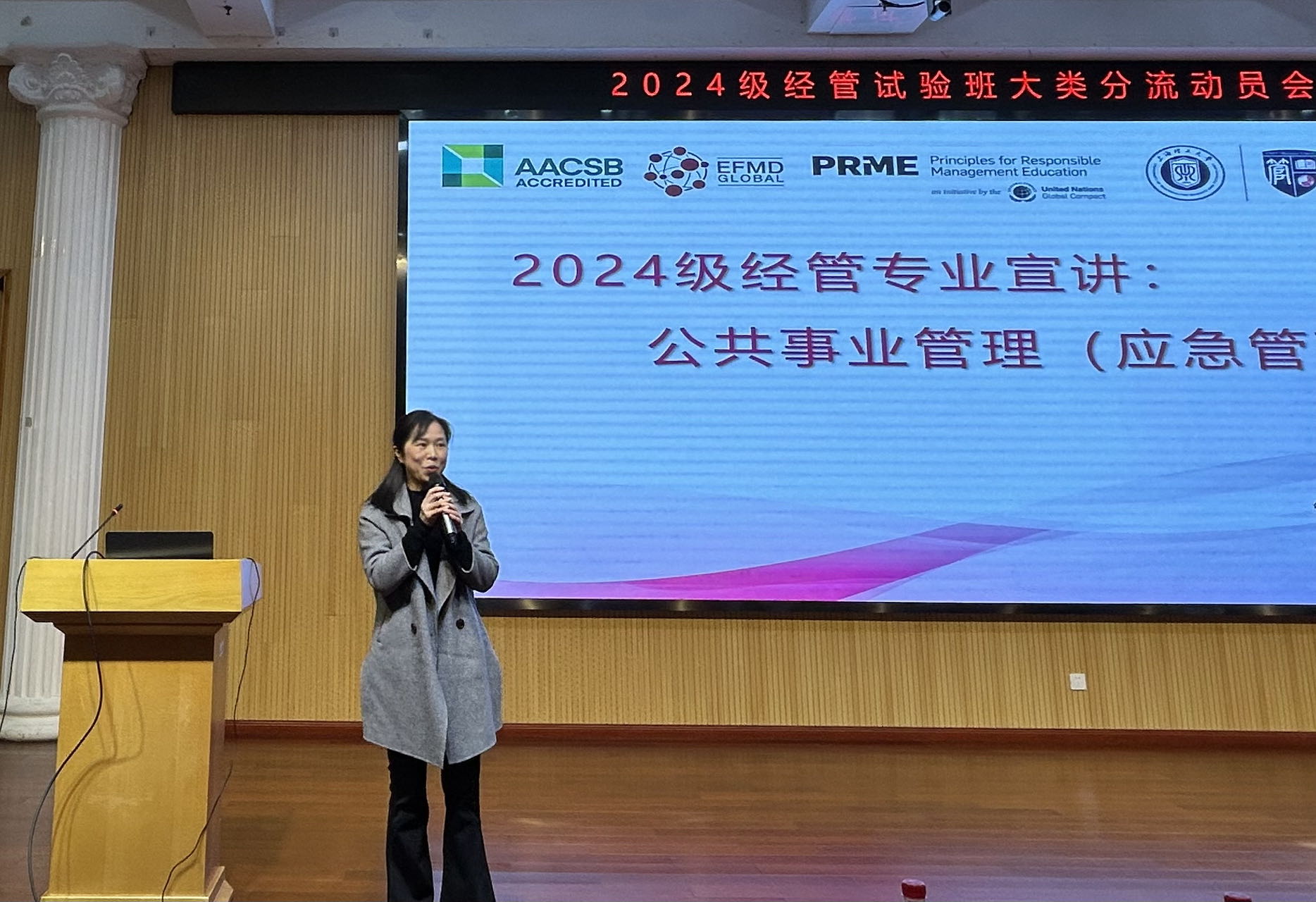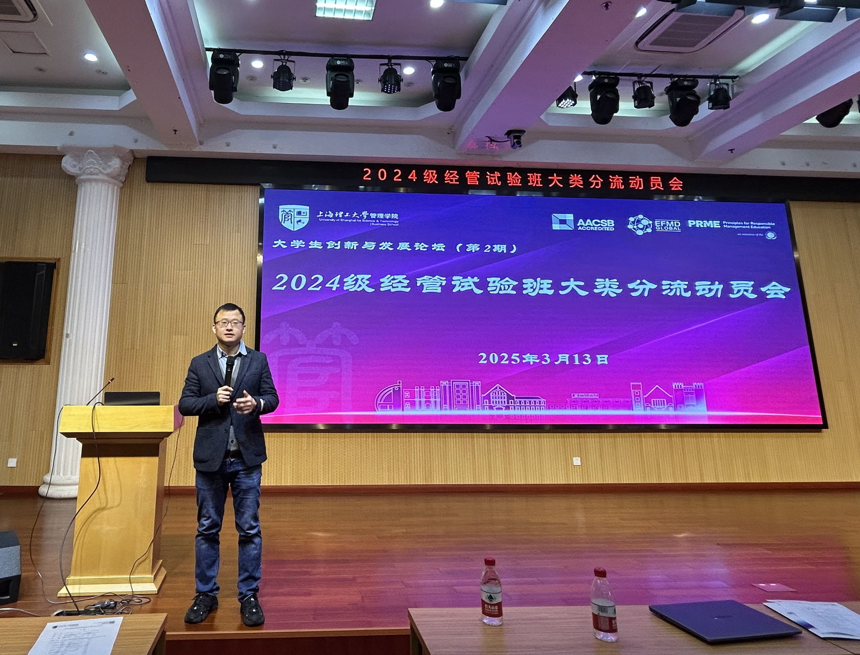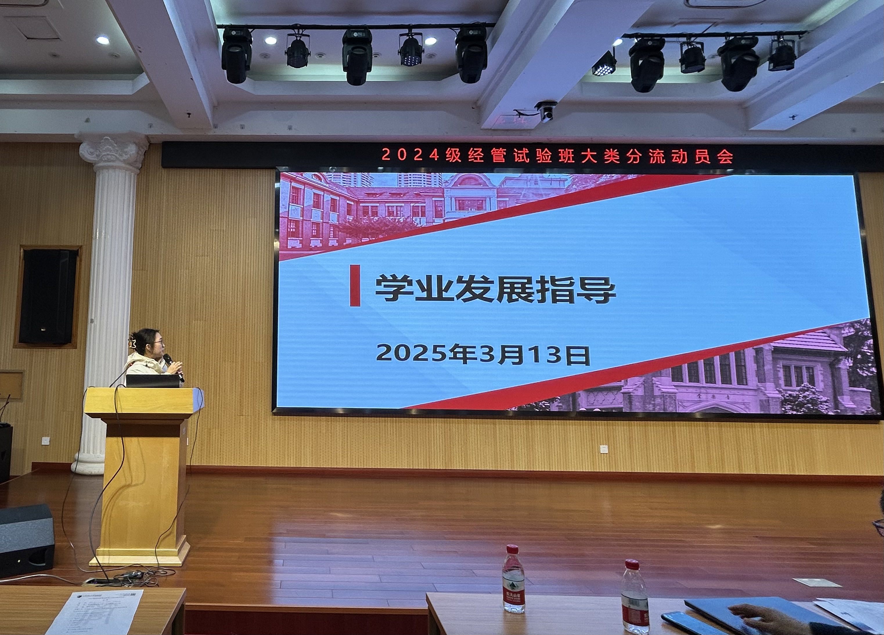 3月13日上午,管理学院大学生创新与发展论坛第二期活动——2024级经济管理试验班大类分流动员会在第一会议室召开。会议由副院长房志明主持,各系负责人、教务办成员以及270余名2024级经济管理试验班学生参加了会议。