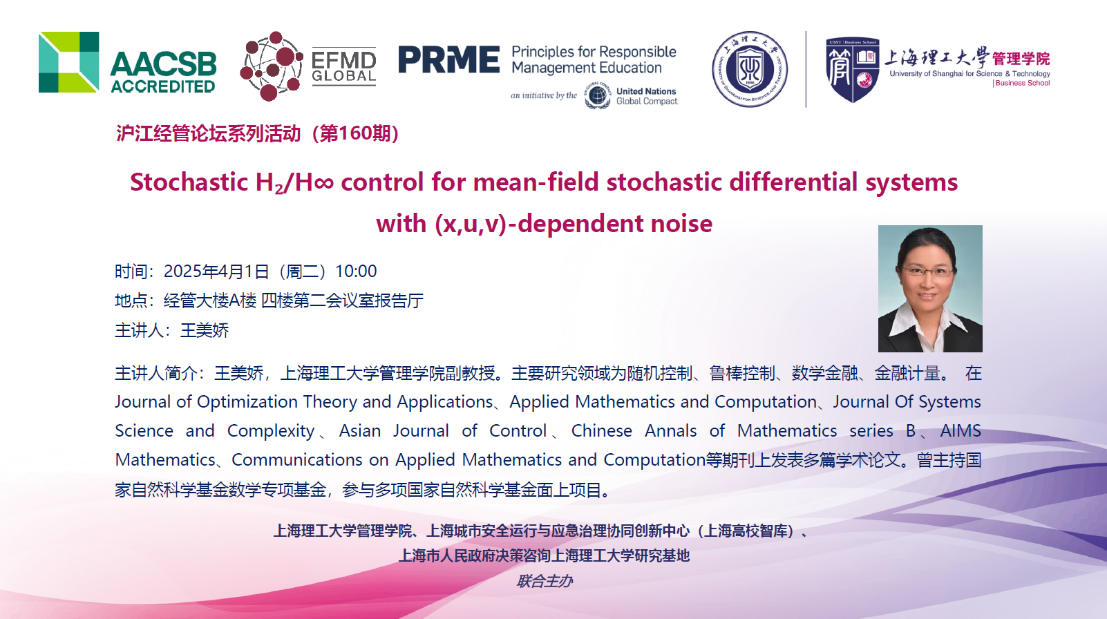 沪江经管论坛系列活动(第160期):Stochastic H₂/H∞ control for mean-field stochastic differential systems with (x,u,v)-dependent noise