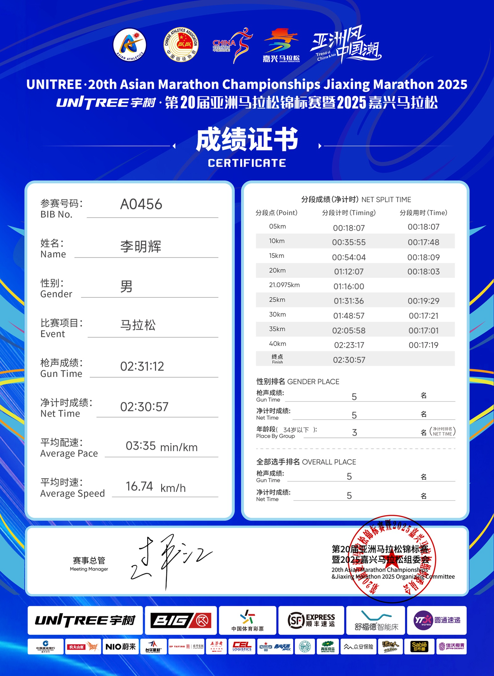 2025年3月30日,第20届亚洲马拉松锦标赛暨2025嘉兴马拉松在浙江省嘉兴市圆满落幕。来自全国各地的2万余名跑者齐聚嘉兴,与非洲、亚洲顶尖马拉松选手同场竞技。上海理工大学管理学院本科生李明辉在激烈的竞争中脱颖而出,以2小时30分57秒的成绩获得男子组第五名的佳绩。