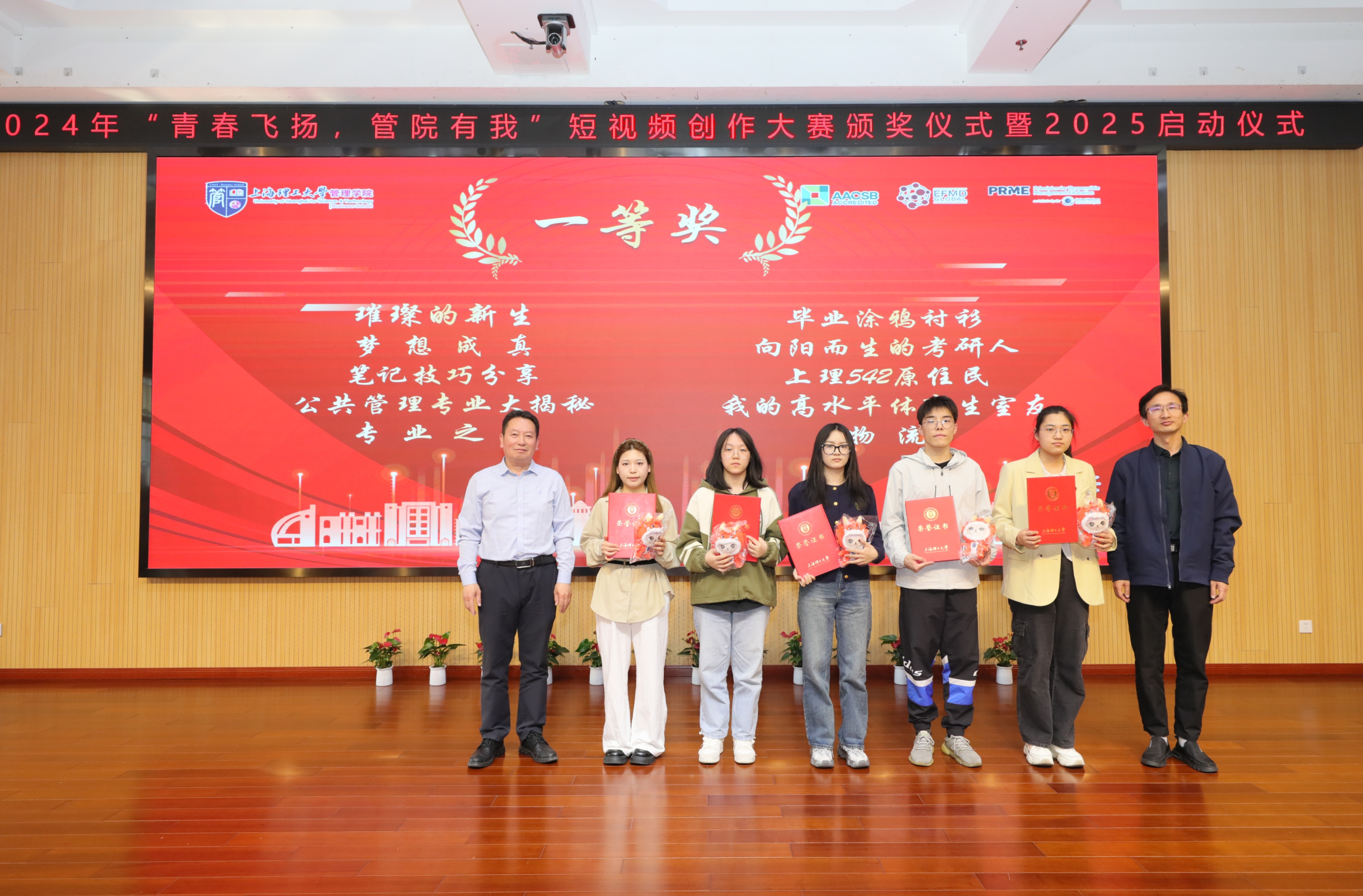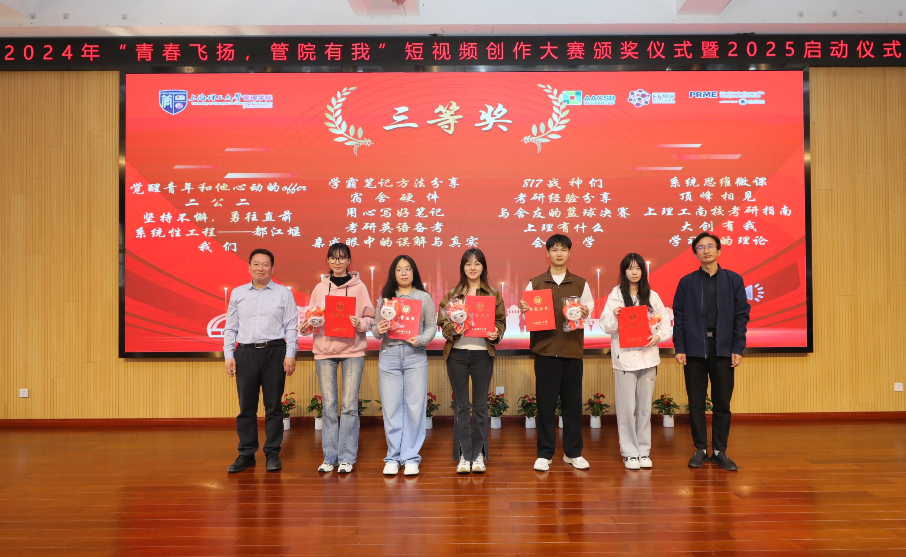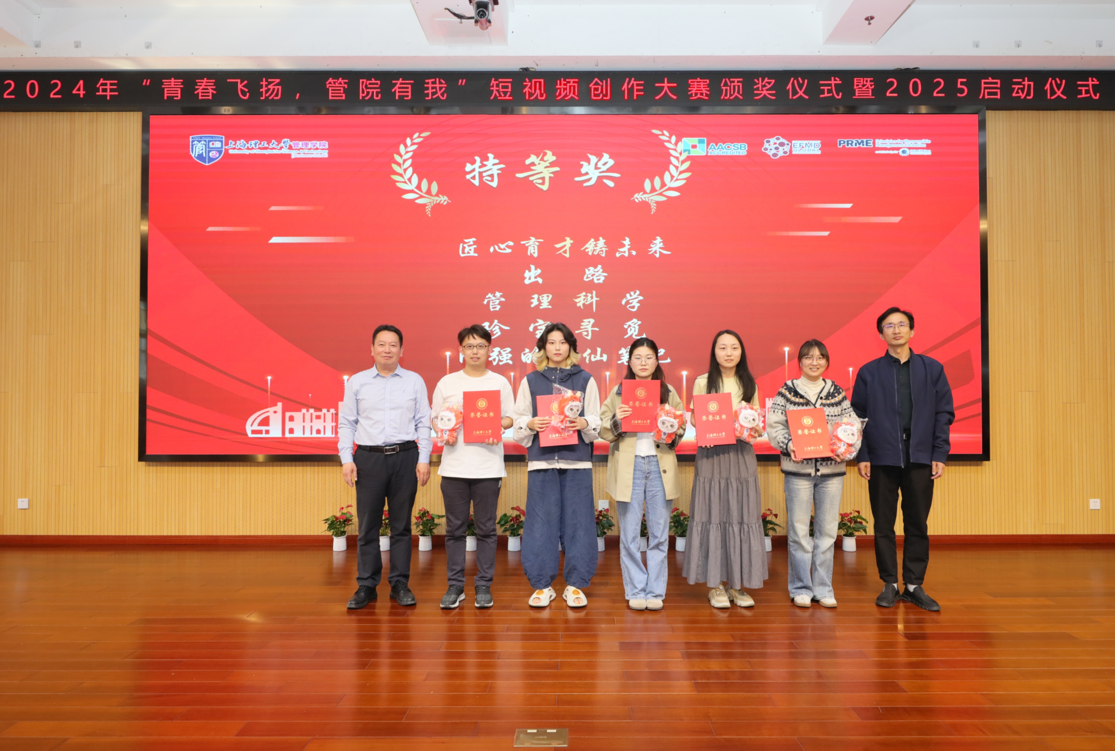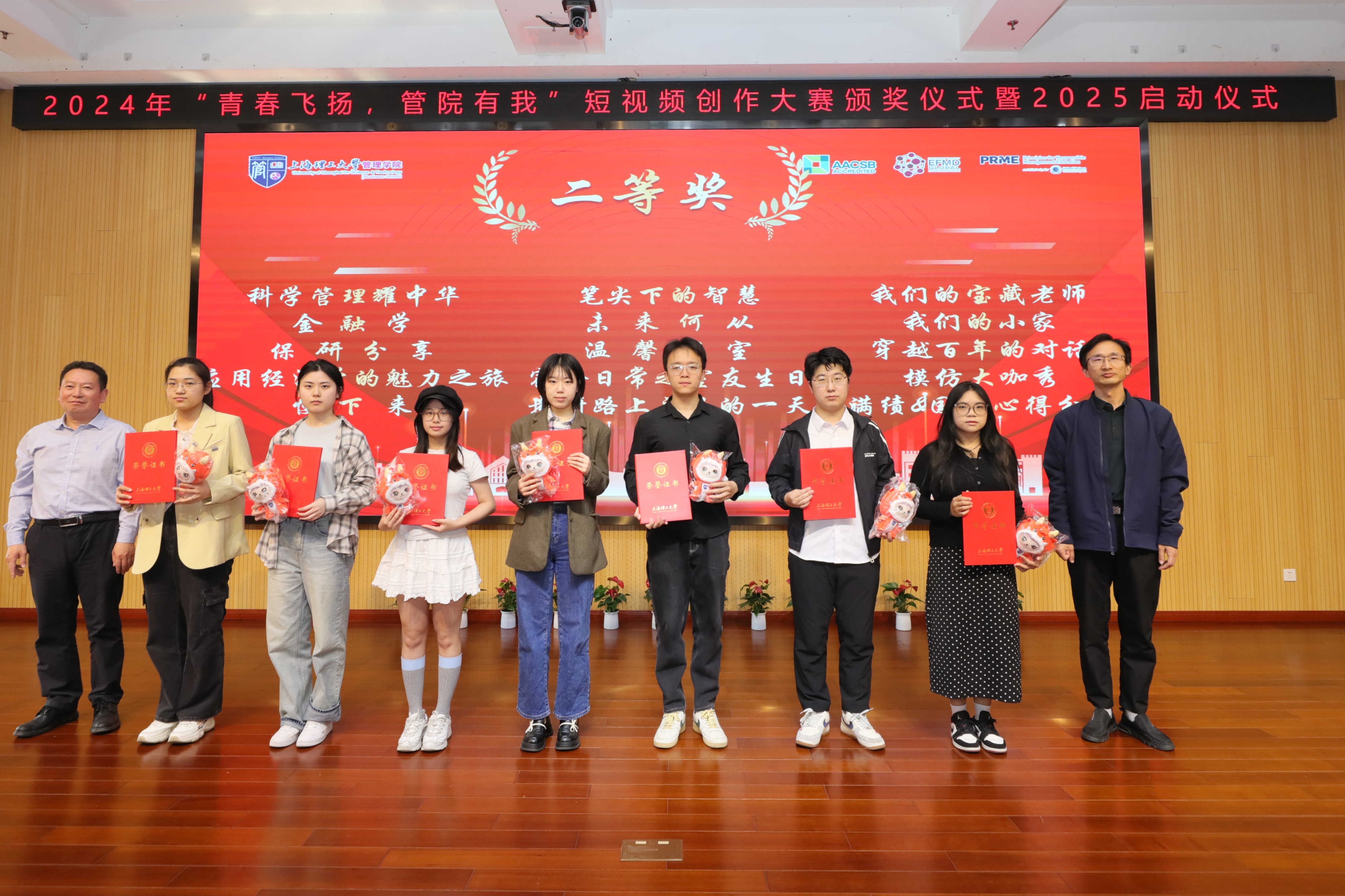 2024年“青春飞扬,管院有我”短视频创作大赛共收到参赛作品117件,经过严格评审,最终评选出特等奖5个、一等奖10个、二等奖15个、三等奖20个。这些作品通过学生喜闻乐见的形式,生动展现了管院学子的青春风采与创新思维。颁奖仪式上,张炜和马静波共同为获奖学生颁奖,并合影留念。