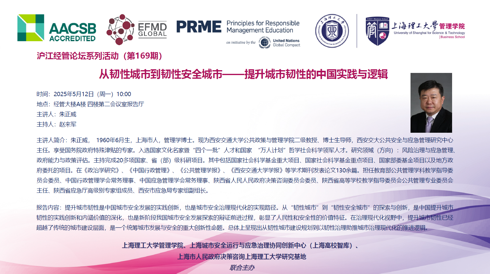 沪江经管论坛系列活动(第169期):从韧性城市到韧性安全城市——提升城市韧性的中国实践与逻辑