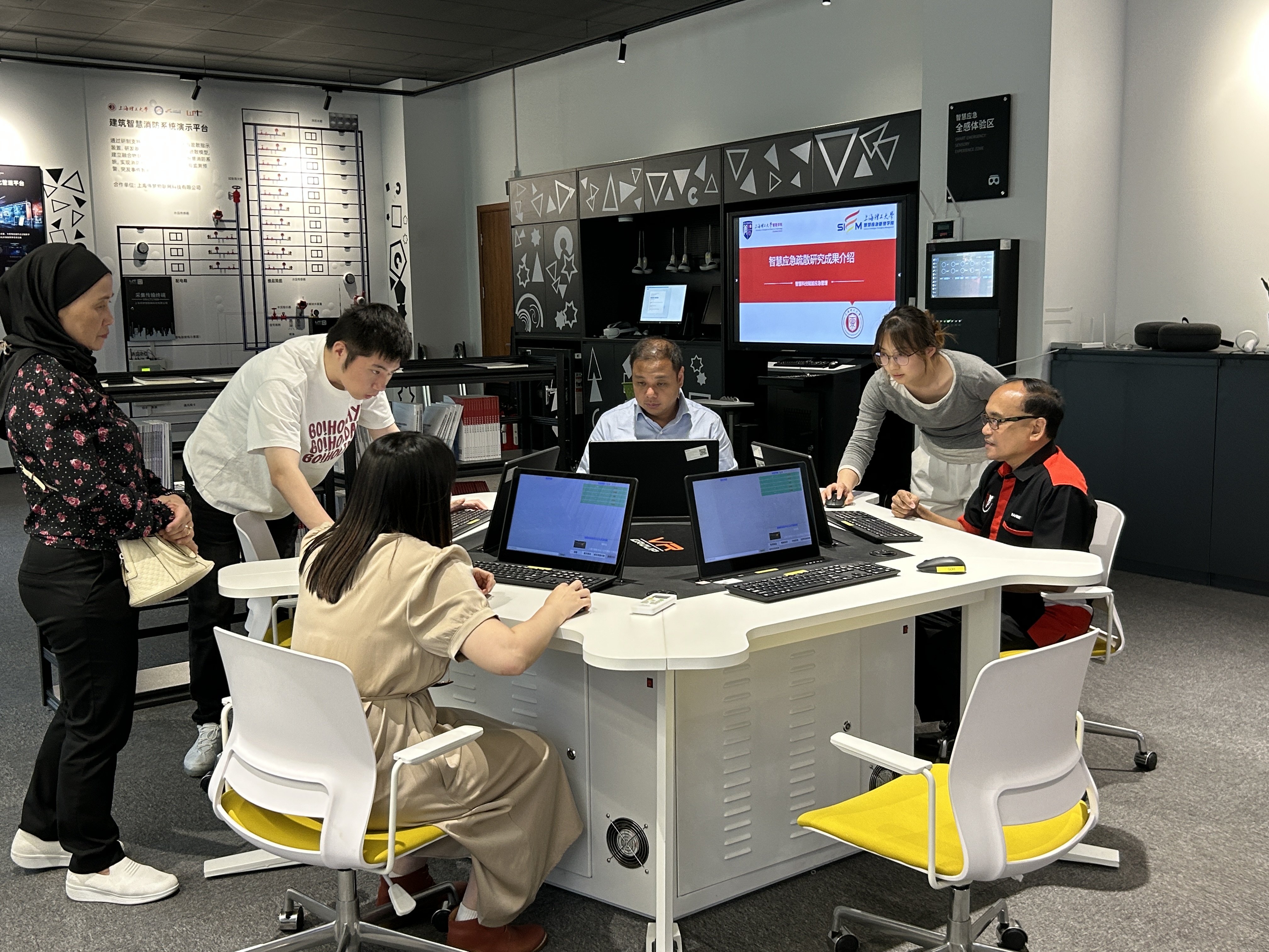 在学院教师陪同下,来访教师参观了智慧应急管理实验室。实验室负责人向代表团介绍了实验室在城市安全、应急响应、风险预警等方面的研究方向及成果。代表团沉浸式体验了实验室设备,对学院先进的科研平台及高度贴近社会需求的研究课题表示肯定,并希望在未来探索更多合作可能。