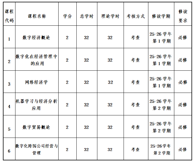 数字经济与贸易微专业共开设6门课程,共计12学分,学习周期为2学期,1学年。