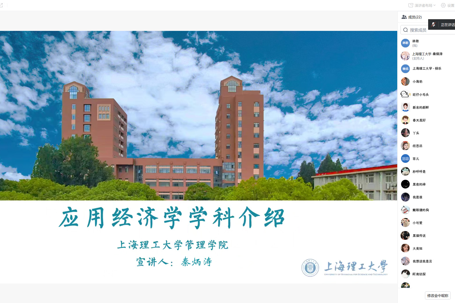 为展示我校研究生培养优势、吸引优质生源,上海理工大学应用经济学学科在5-6月展开了为期一个月的线上线下招生宣讲工作。系列宣讲活动共吸引了各地高校的360余名学生参加。