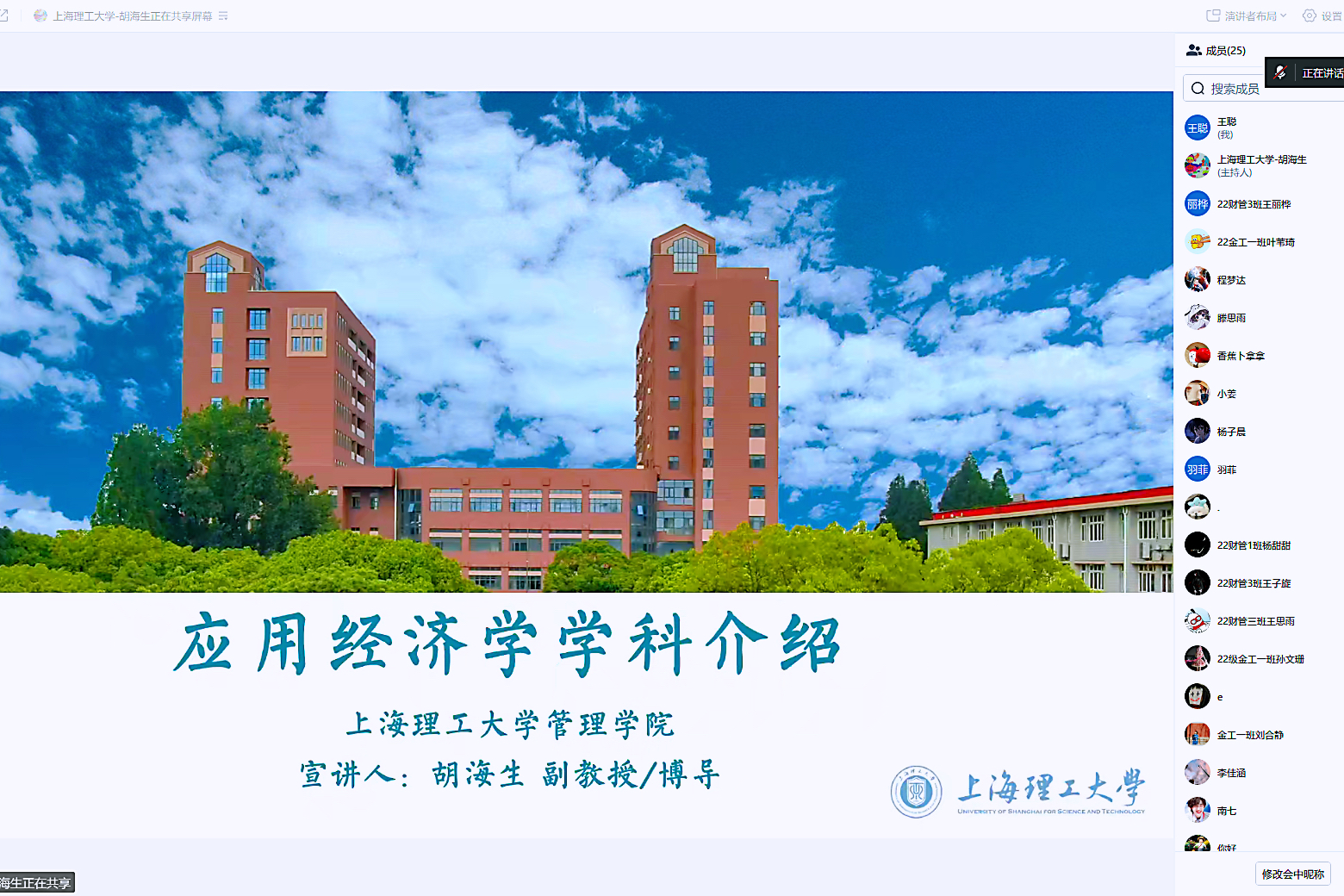 线上宣讲会上,徐佳文、胡海生、秦炳涛分别介绍了上海理工大学百年工科底蕴与应用经济学学科优势。学科依托学校装备制造、医疗器械等行业资源,突出“经济学+工学”交叉特色,与国际院校长期合作,培养兼具理论素养与实践能力的复合型人才。