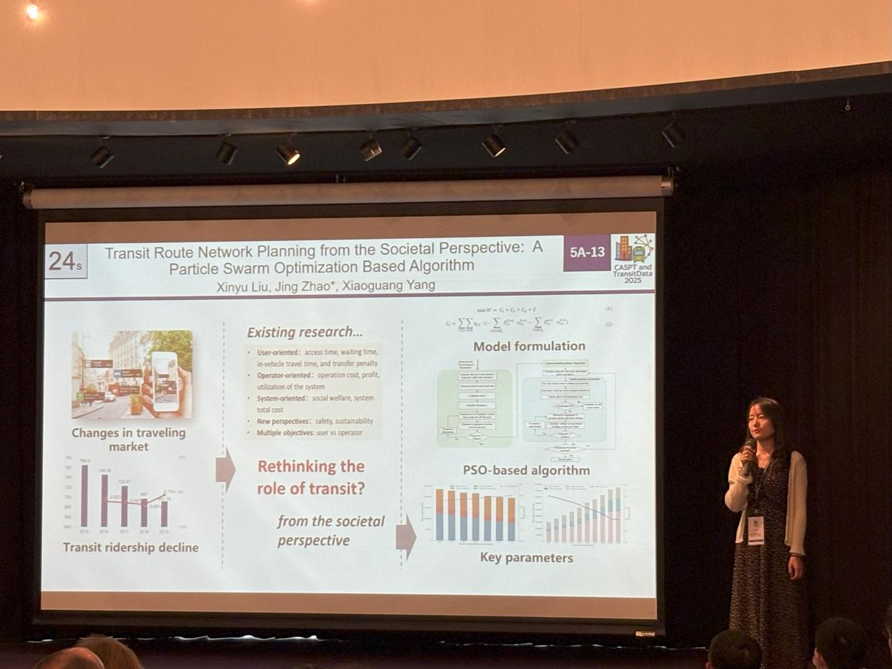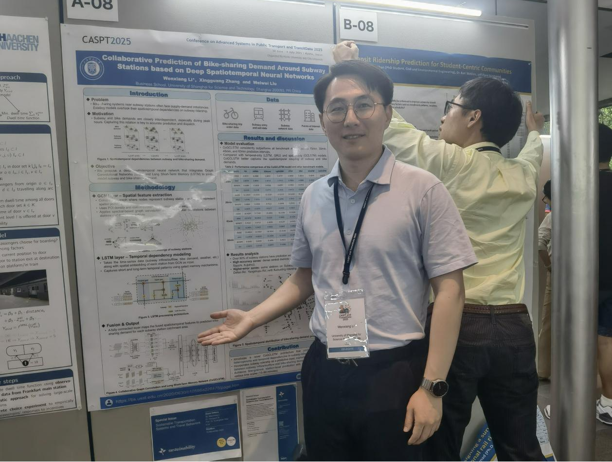 会议期间,赵靖主持多模式与出行方式选择口头报告分会场(Session O5A: Multimodal and Mode Choice),孙文喆担任大会日方致辞的英文翻译并作题为Pricing Premium-Class Seats in Transit Fares的口头报告,李文翔作题为Collaborative Prediction of Bike-Sharing Demand Around Subway Stations Based on Deep Spatio-Temporal Neural Networks的海报报告,刘心雨作题为Transit Route Network Planning from the Societal Perspective: a Particle Swarm Optimization Based Algorithm的海报报告。