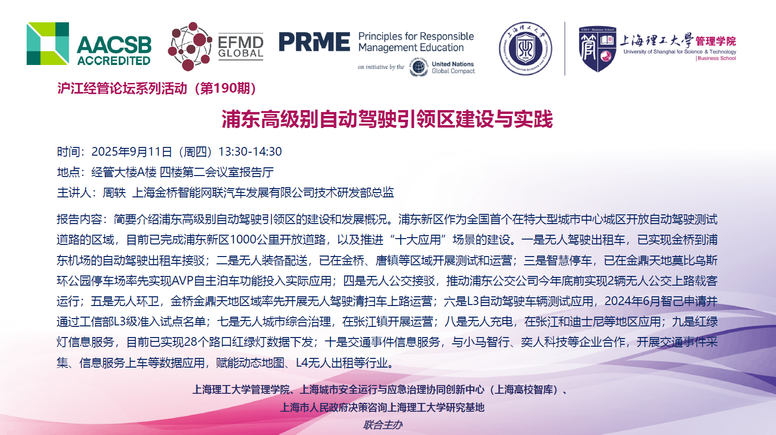 沪江经管论坛系列活动(第190期):浦东高级别自动驾驶引领区建设与实践
